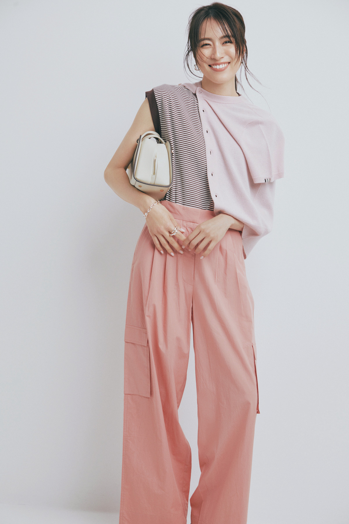 ピンクコーデを大人っぽく着こなすなら、カジュアルアイテムを投入するのがポイント。ブラウンのボーダーTは甘カジュアルの橋渡しにぴったりです。