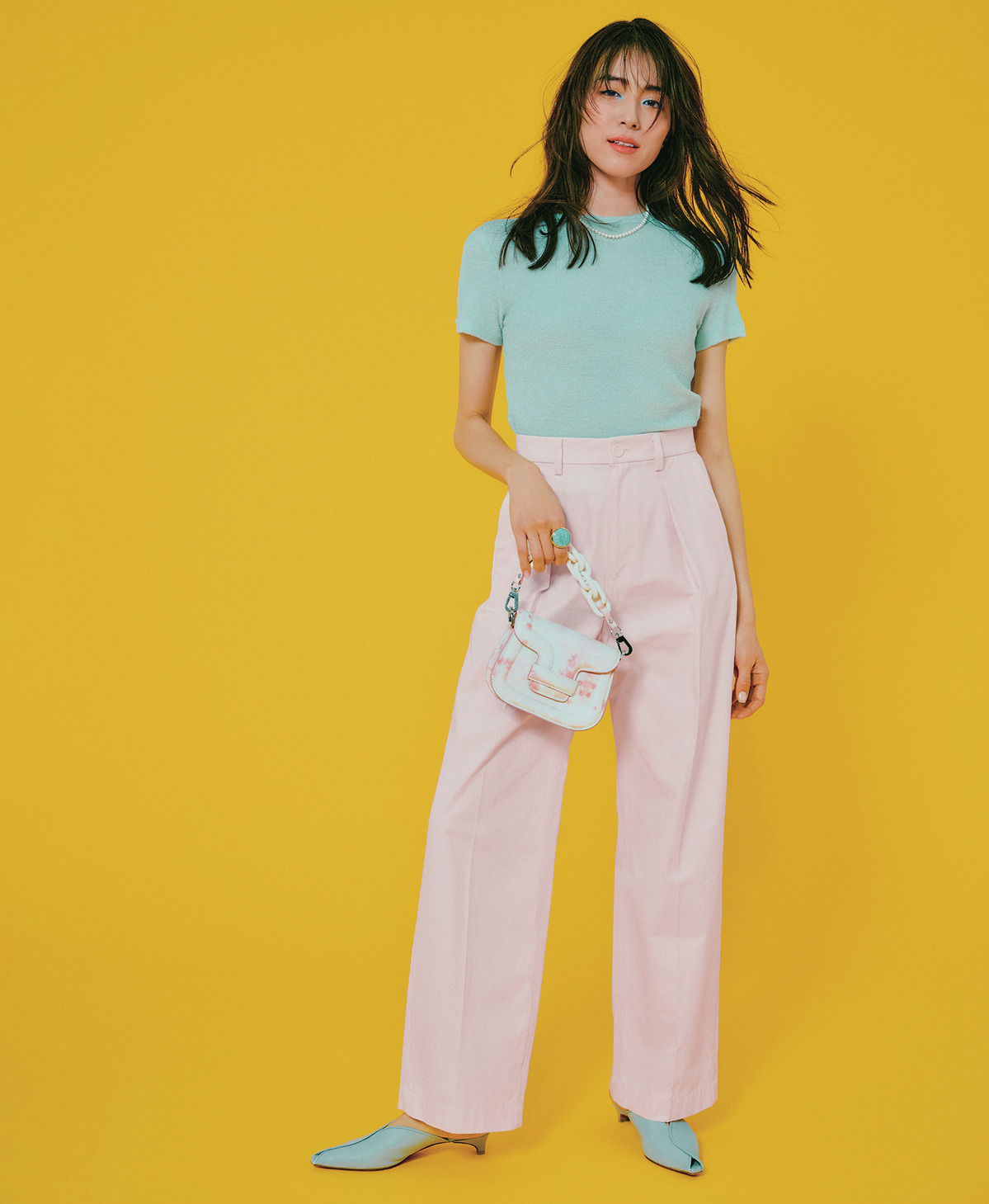 難易度の高そうなカラー×カラーの組み合わせは、小物含めて3色以内におさめるのが◎。反対色の組み合わせでもまとまって見えます。