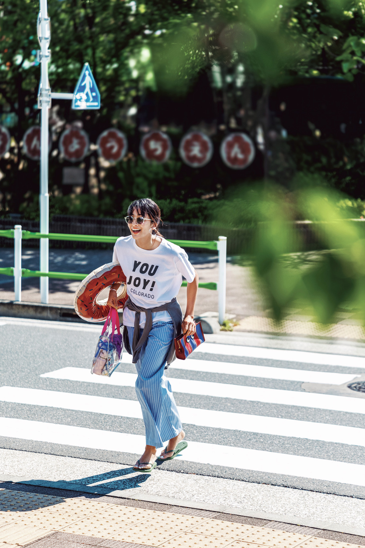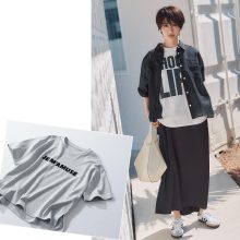 ゆるボトムス×ビッグTをアウトしたゆるゆるコーデは、おしゃれだけど着ぶくれする場合も。思わず読みたくなるロゴTにウエストに羽織りものを巻くだけでメリハリが付き、おまけに荷物も減らせて一石二鳥なので試さない手はない!