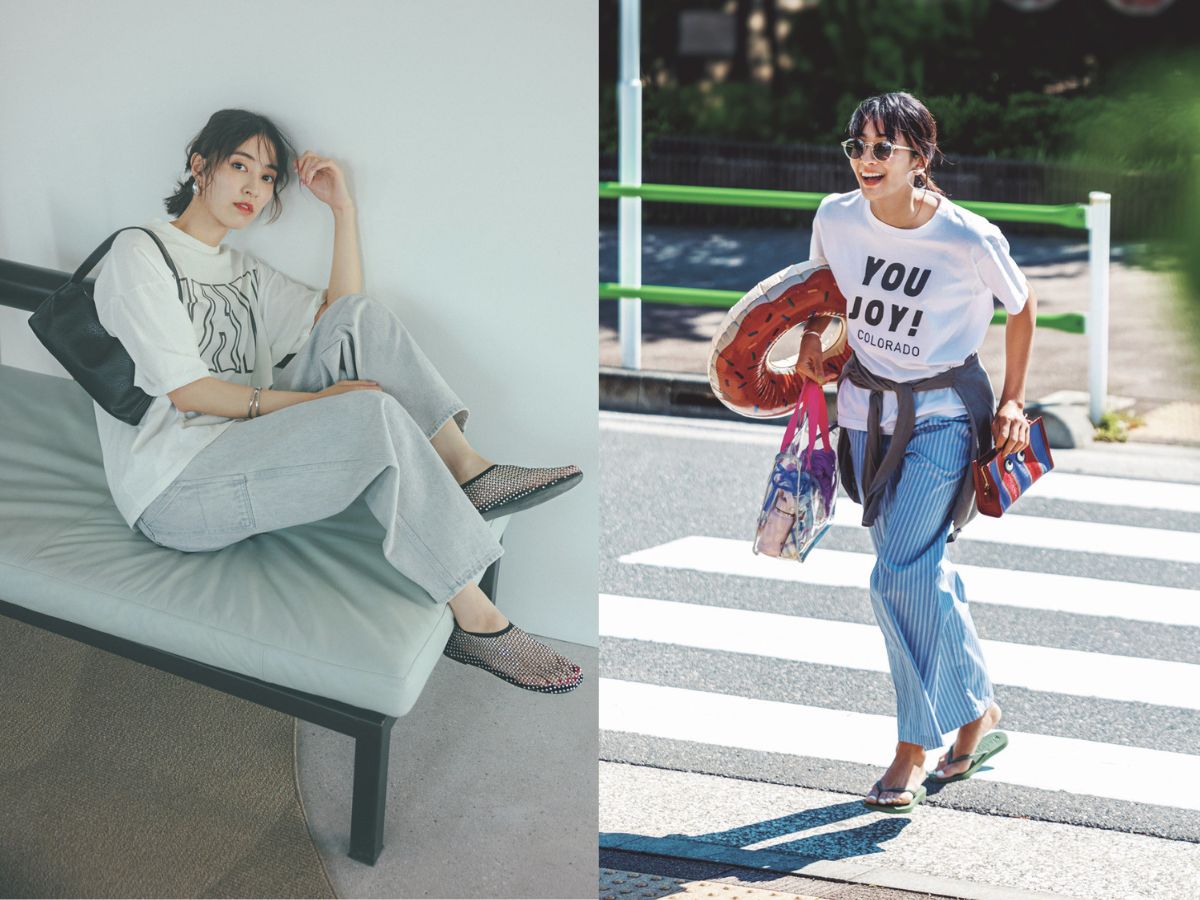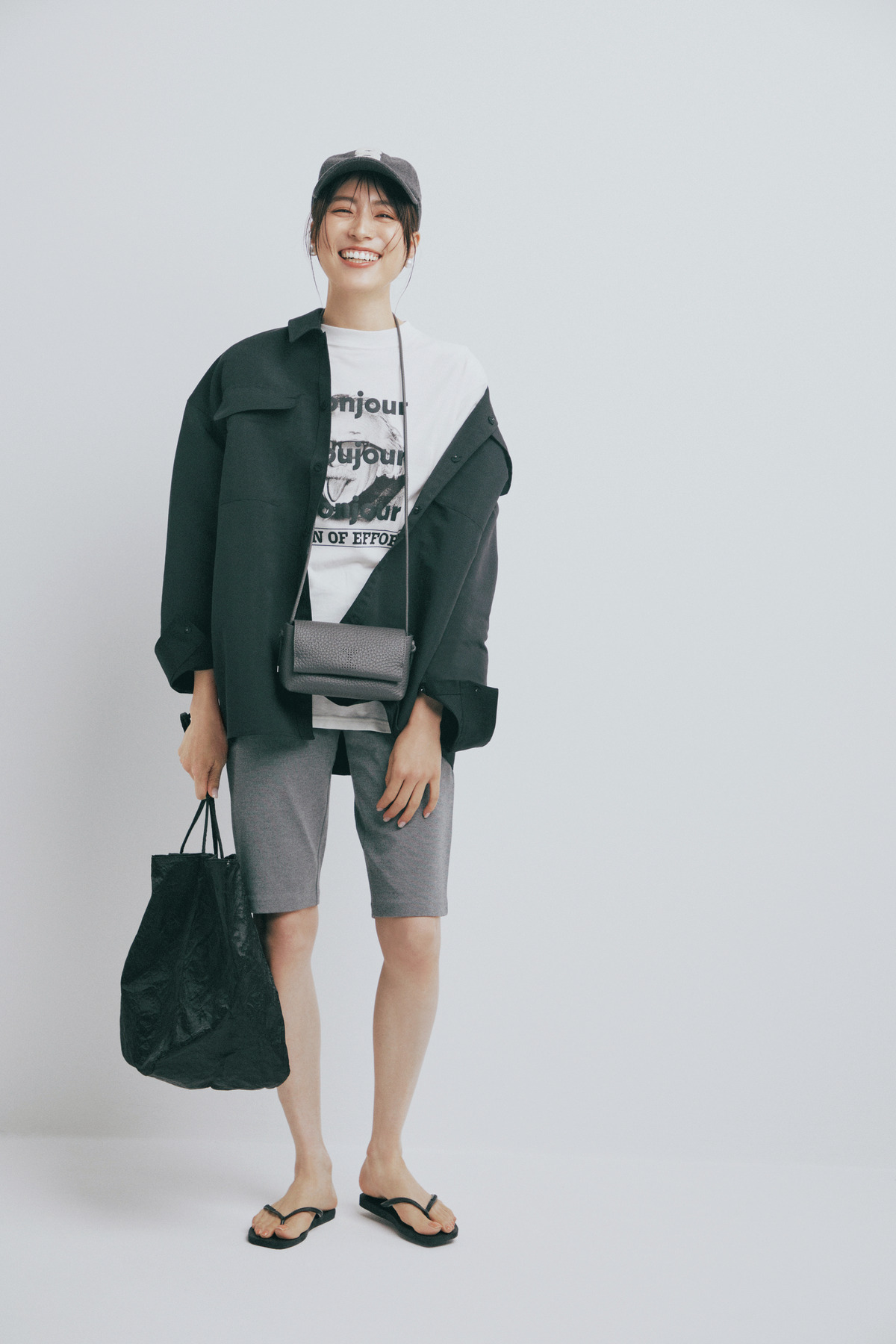 ゆるっとTシャツを着るときは少し肌見せすると着痩せ度アップ。流行りのショートパンツも体が泳ぐTシャツとなら自信をもって着られそう。シアーT重ね着やヒールで透け感を出すとスポーティになりすぎず、ほんのり色っぽく。