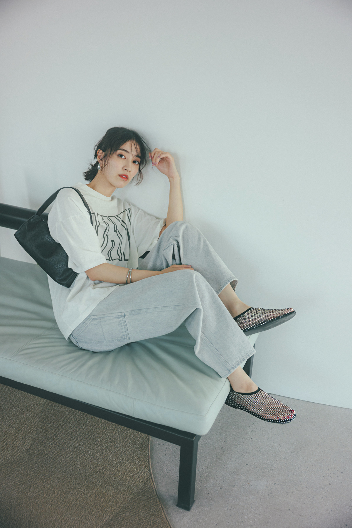 デニムの色が変わるだけでTシャツ×デニムの制服コーデがモードな印象に。Tシャツがビッグサイズなので、靴はヌーディなものを選んで抜け感を出すと、赤ネイルがチラ見えして差し色効果も。