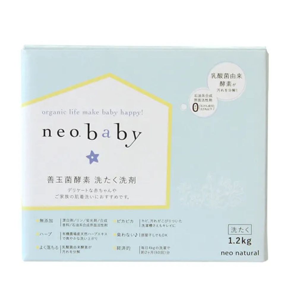 ネオベビー 善玉菌酵素洗たく洗剤 ¥1,320(株式会社ネオナチュラル)/1.2kg/粉末タイプ/成分:アルカリ剤(炭酸ナトリウム)、水軟化剤(クエン酸ナトリウム)、分散剤(硫酸ナトリウム)、再汚染防止剤(カルボキシメチルセルロース)、酵素、植物由来脂肪酸、善玉発酵菌由来酵素、香料(ラベンダー、ローマンカモミール、ボリジ)/香り:ごく微かなハーブの香り