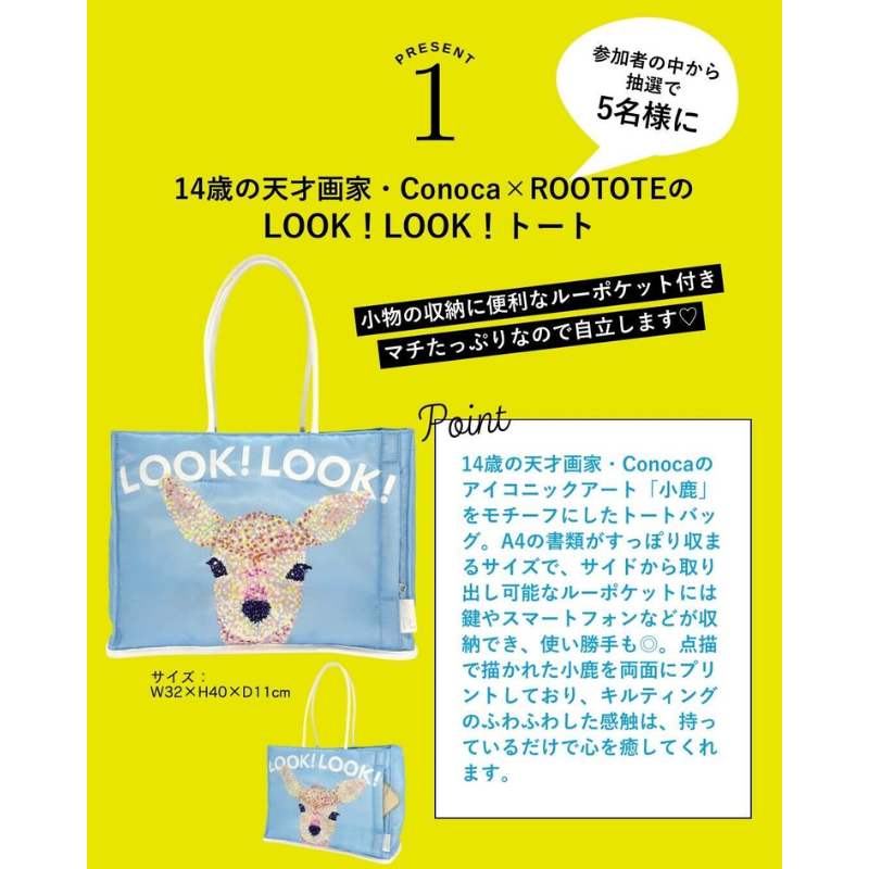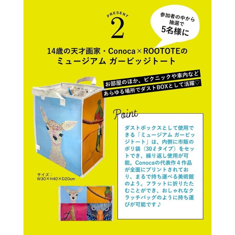 さらに!今回参加していただいた方の中から抽選で、豪華プレゼントが当たるチャンスも。14歳の天才画家・Conoca×ROOTOTEの「LOOK!LOOK!トート」と「ミュージアム ガービッジトート」を各5名様にプレゼントいたします。詳しい応募方法は下記をチェック!