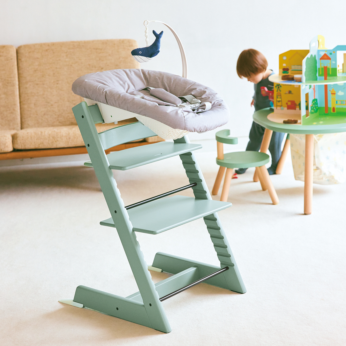 トリップ トラップに簡単に装着できる〝ニューボーンセット〟。新生児から家族と同じ目線で一緒の食卓に。トイハンガー付き、生後6カ月頃(9㎏未満)まで使用できます。