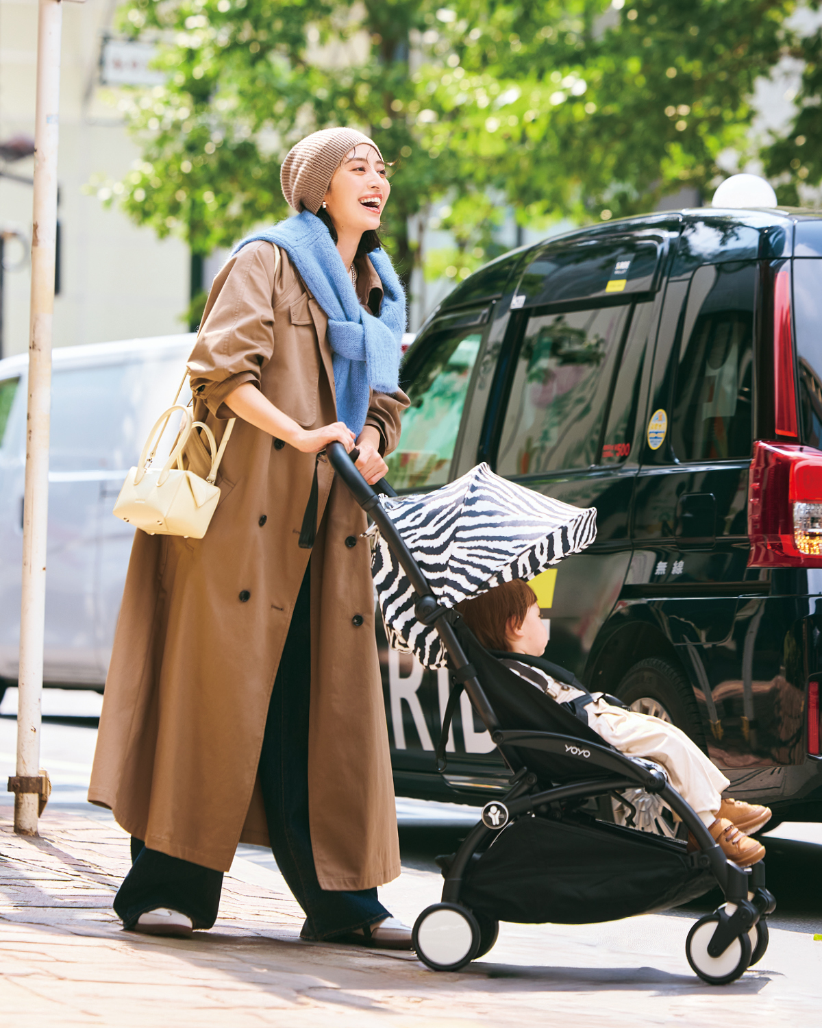 ベビーカー「YOYO® wild コレクション」¥67,430(ストッケ) コート¥41,800(エレンディーク) ニット¥60,500(フィリッポ デ ローレンティス/トヨダ トレーディング プレスルーム) デニムパンツ¥14,300(リーバイス®/リーバイ・ストラウス ジャパン) 肩にかけたカーディガン¥41,800(スローン/ザ ショップ スローン 新静岡セノバ店) ニット帽¥7,990(ムジラボ/無印良品 代官山) ピアス¥55,000(モニス/フォーティーン ショールーム) バッグ¥19,800(アドカラム/アンソロジー) スニーカー¥15,950(アスファルト/アースマーケティング)[ベビー]カットソー¥5,500 サロペット¥12,100(ともにマールマール) シューズ¥8,800(アグ/デッカーズ ジャパン) ソックス/スタイリスト私物