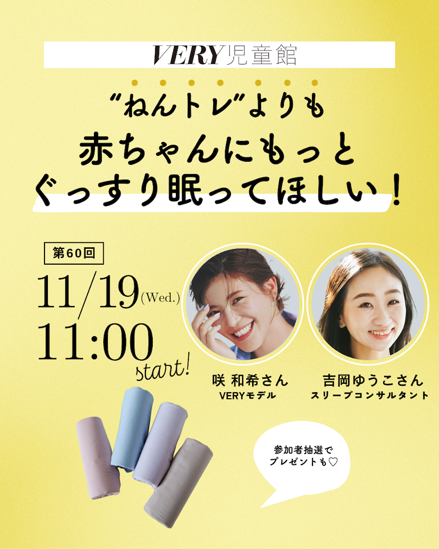 ■内容:今月はスリープコンサルタントの吉岡ゆうこさんをお迎えして、赤ちゃんがぐっすり眠れる環境の整え方などを教えてもらいます。さらに今回は、産後初のVERY児童館出演となる咲 和希ちゃんがゲストとして登場! リアルな乳幼児ママとして、みなさんと共感できることも多いはず。和希ちゃんへの質問も募集します♡