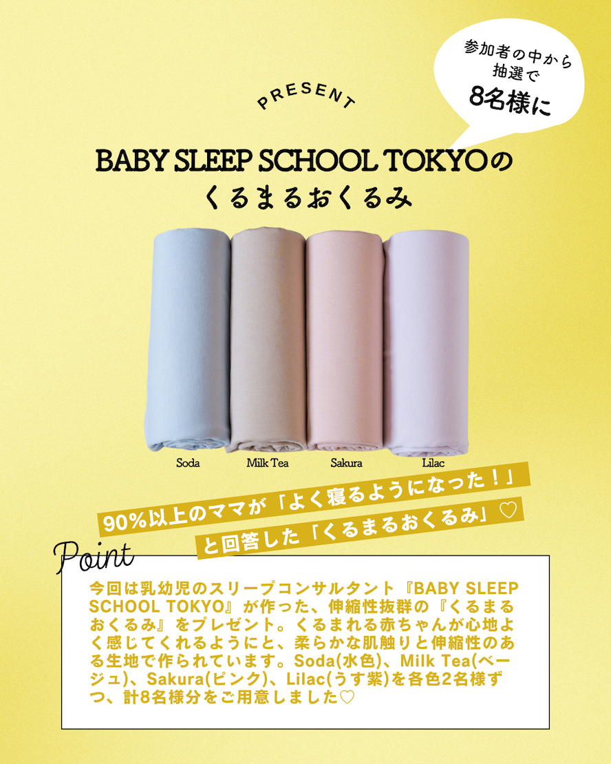 今回参加していただいた方の中から抽選で、豪華プレゼントが当たるチャンスも。乳幼児のスリープコンサルタント「BABY SLEEP SCHOOL TOKYO」が作ったくるまるおくるみを8名様にプレゼントいたします。ぜひこの機会をお見逃しなく♡