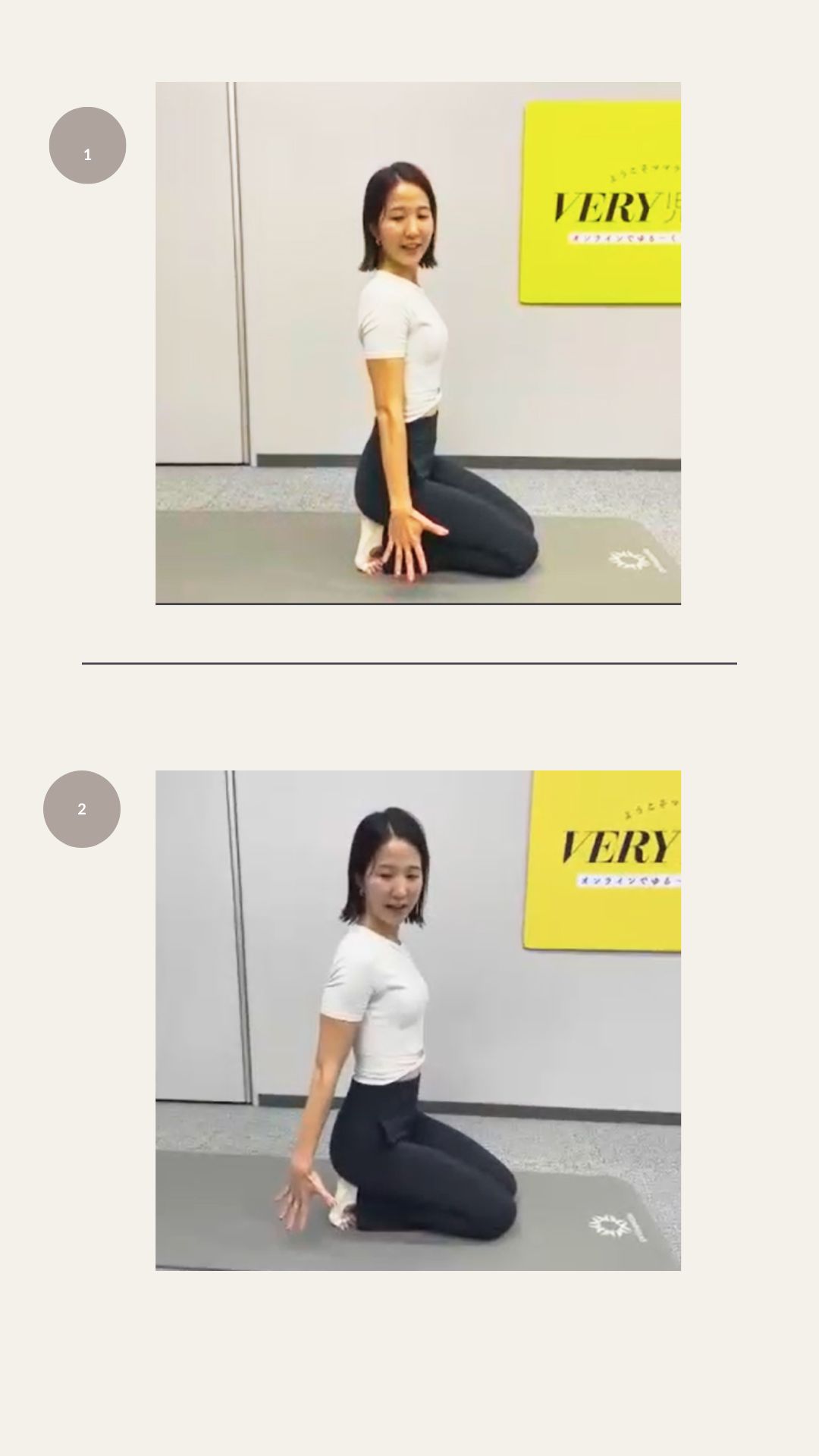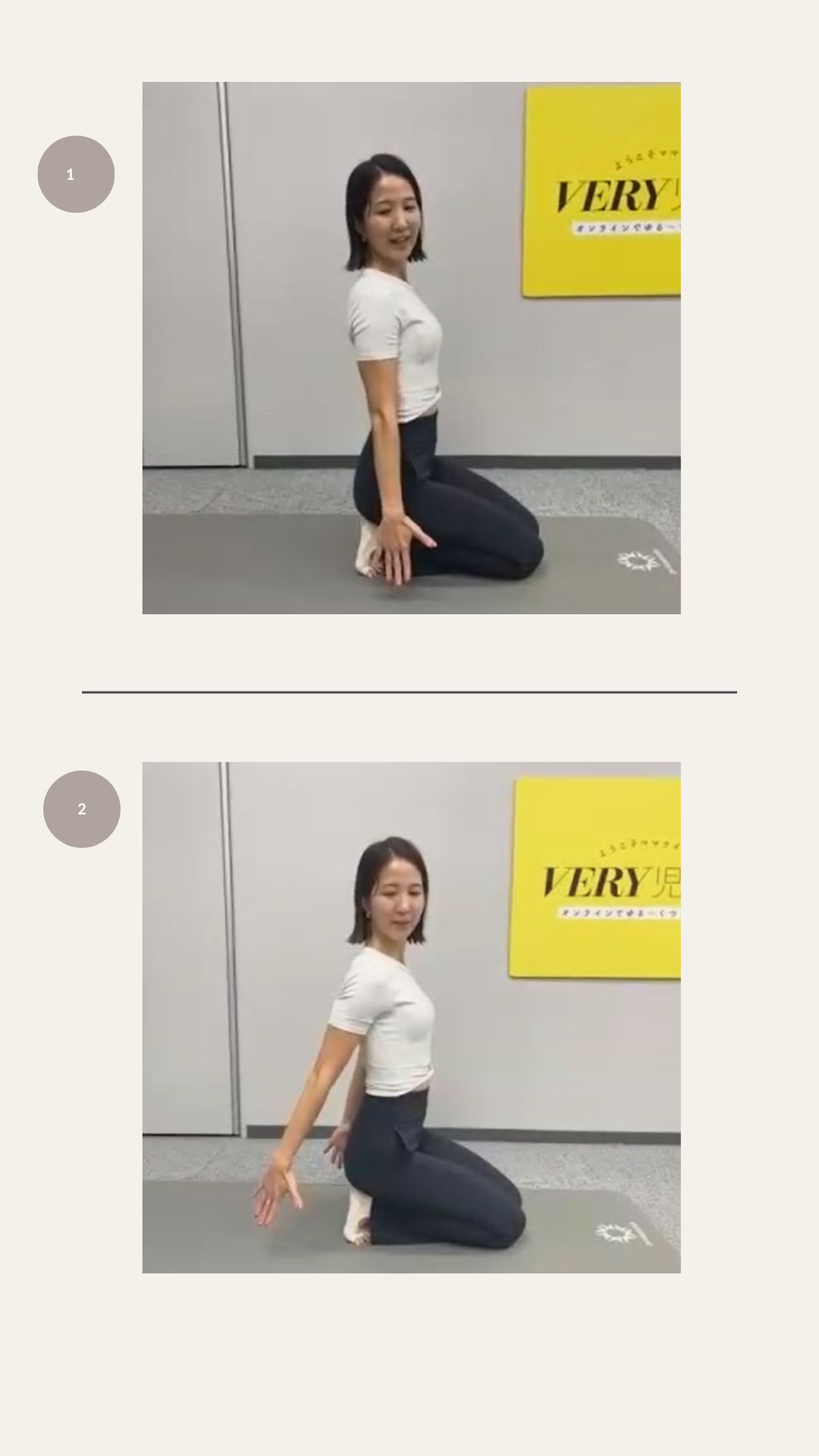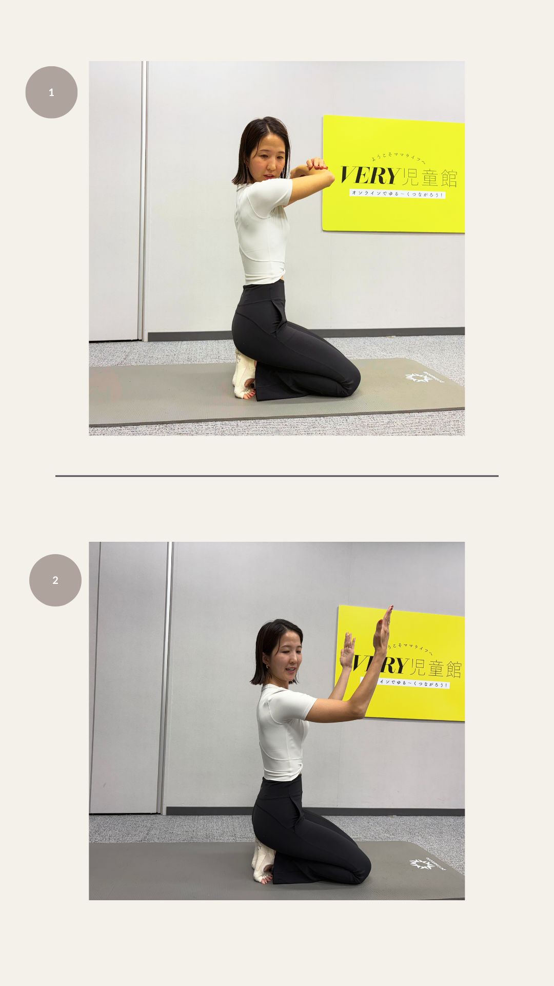 ①膝立ちになり、お尻を踵に付ける。(この体勢が厳しい方は、正座でも◎)恥骨を地面に突き立てるように、骨盤が立っている状態を意識する。