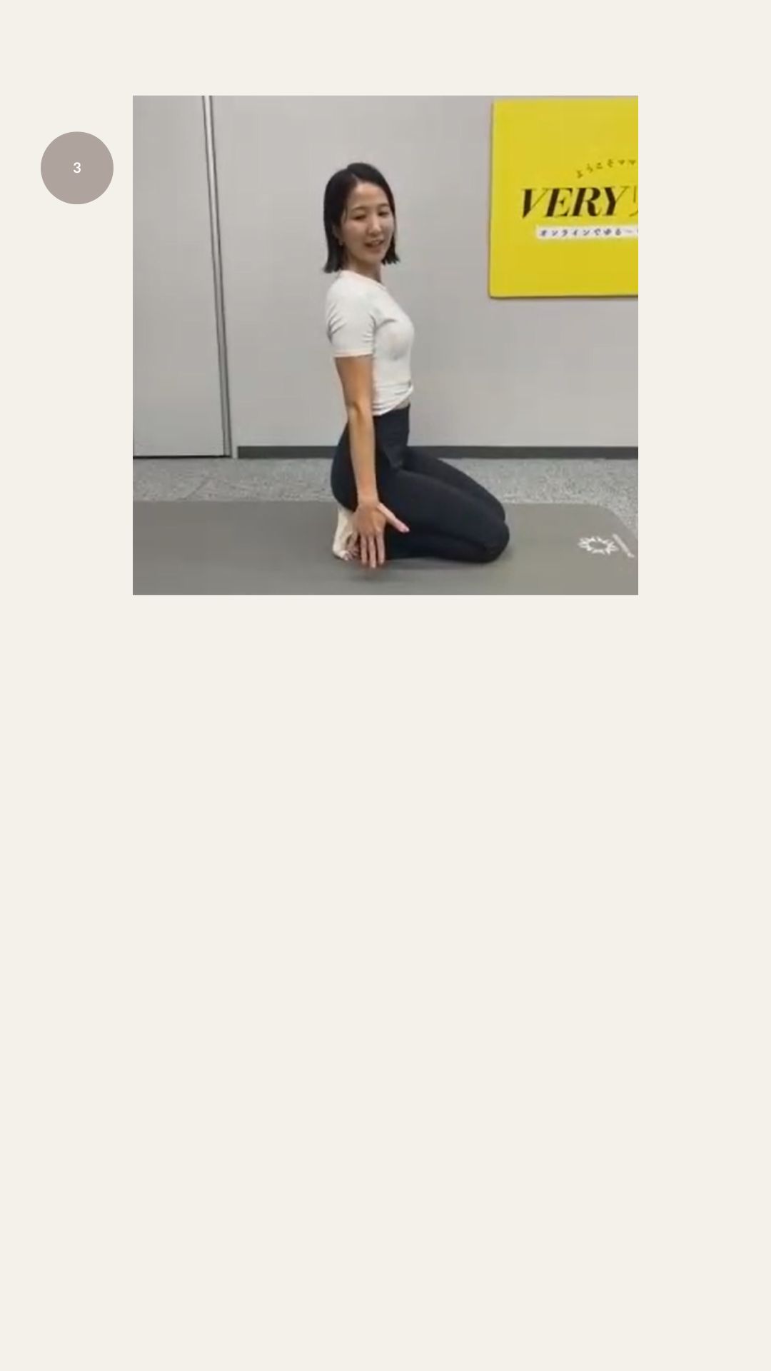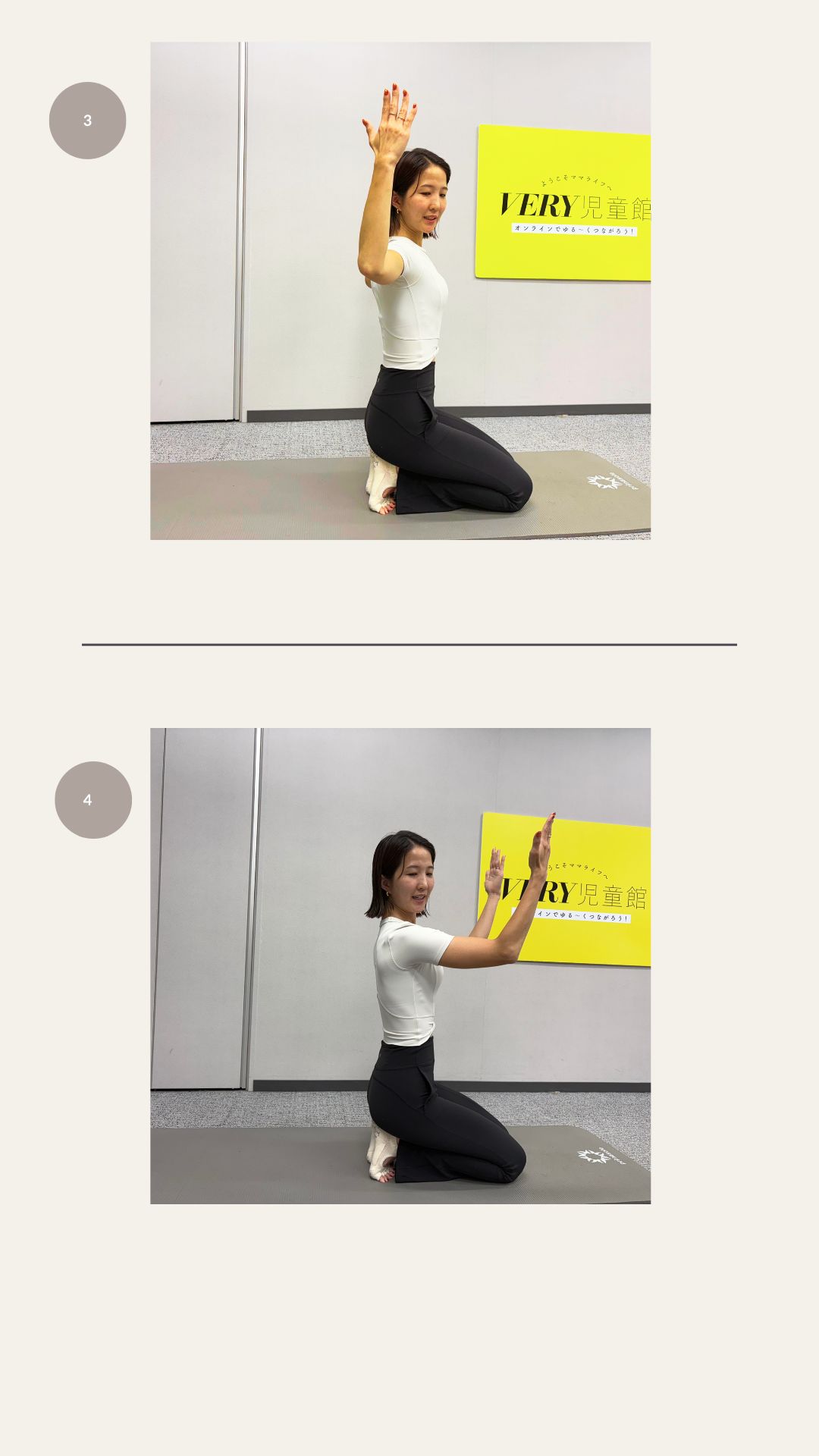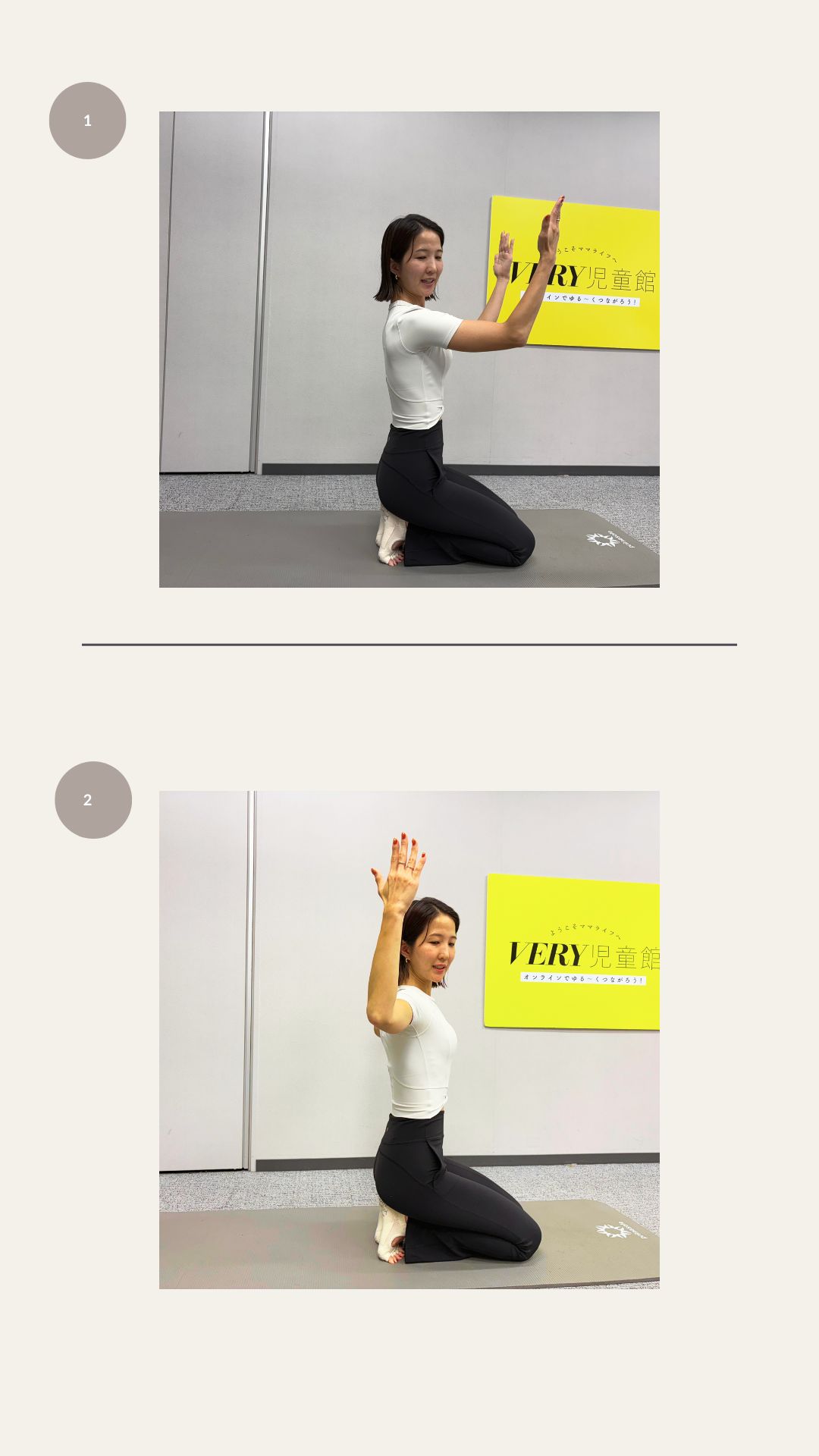 ①膝立ちになり、お尻を踵に付ける。(この体勢が厳しい方は、正座でも◎)恥骨を地面に突き立てるように、骨盤が立っている状態を意識する。