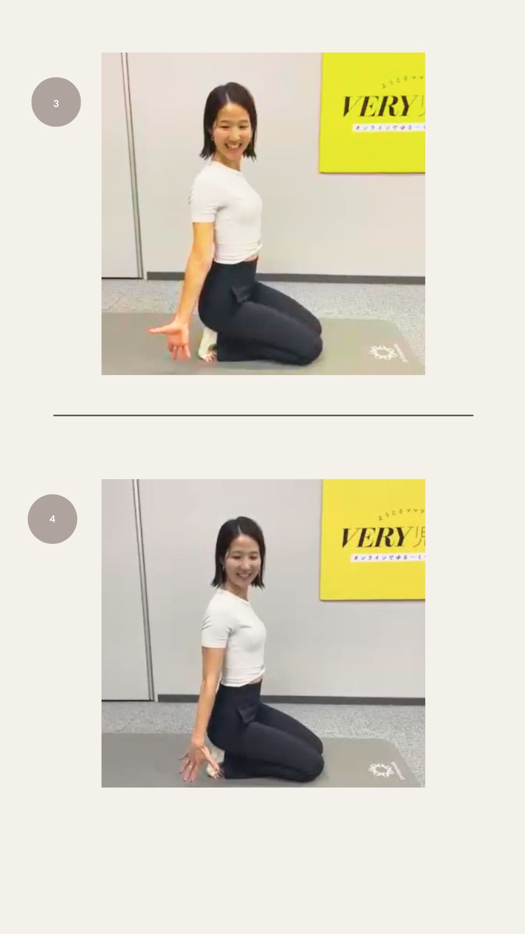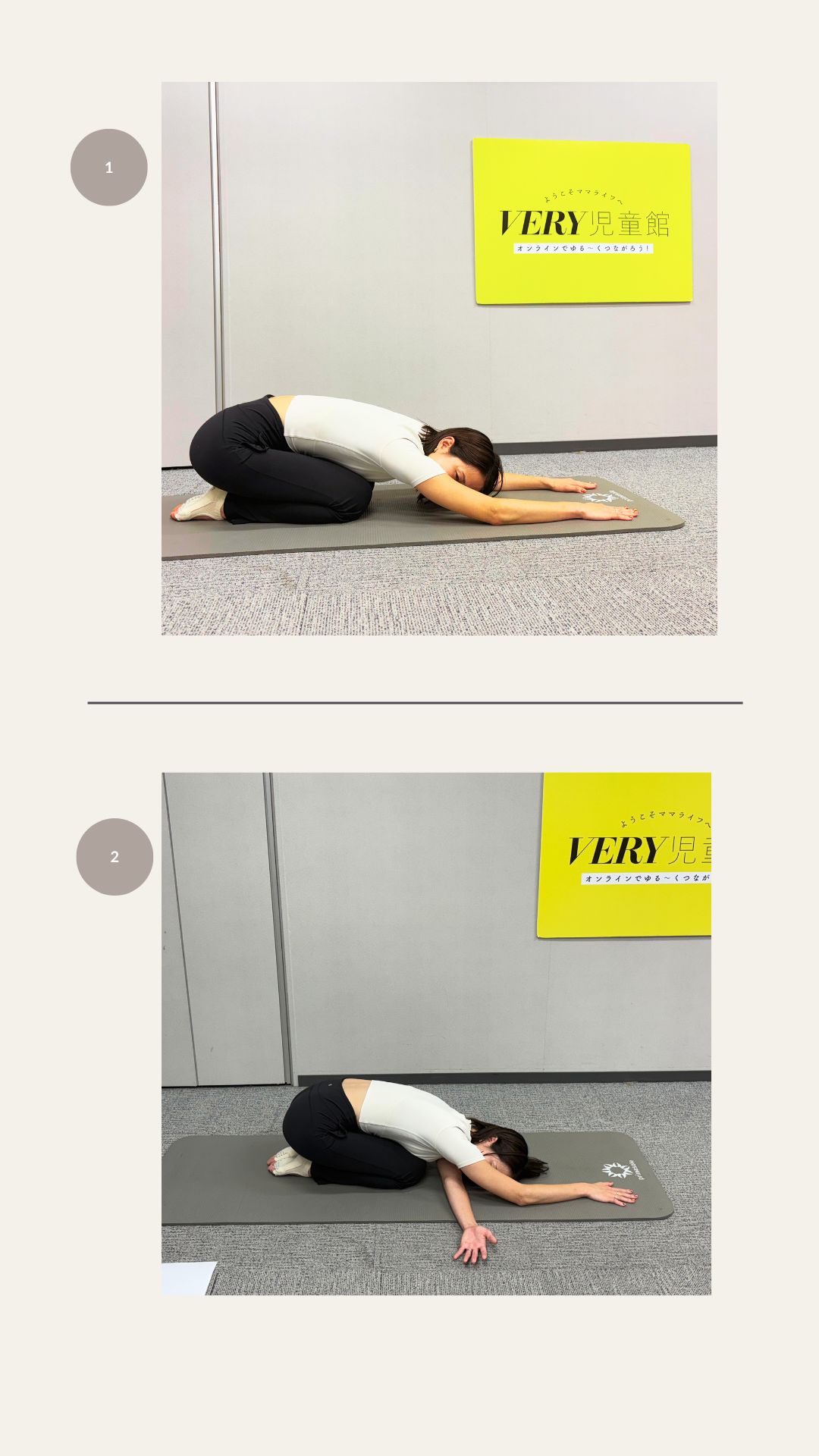 ①正座になって上半身を床に落とし、脱力する。腕はマットに沈み、お尻は後ろに引くイメージ。息を吸って、長く吐く。