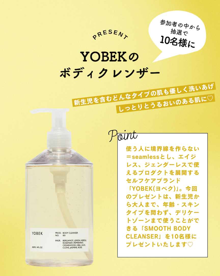 今回参加していただいた方の中から抽選で、豪華プレゼントが当たるチャンスも。セルフケアブランド「YOBEK(ヨベク)」のボディクレンザーを10名様にプレゼントいたします。ぜひこの機会をお見逃しなく♡