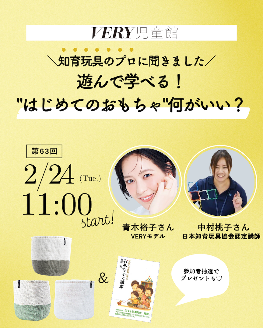新米ママたちとつながり、応援したい!とコロナ禍にスタートした「VERY児童館」。おうち時間が長くなるママたちの息抜きや気分転換になったらとオンラインでの集いを月に1回開催しています。今月のVERY児童館は、【知育玩具】をテーマに開催!ゲストにVERYモデルの青木裕子さんと、日本知育玩具協会認定講師の中村桃子さんが登場します。