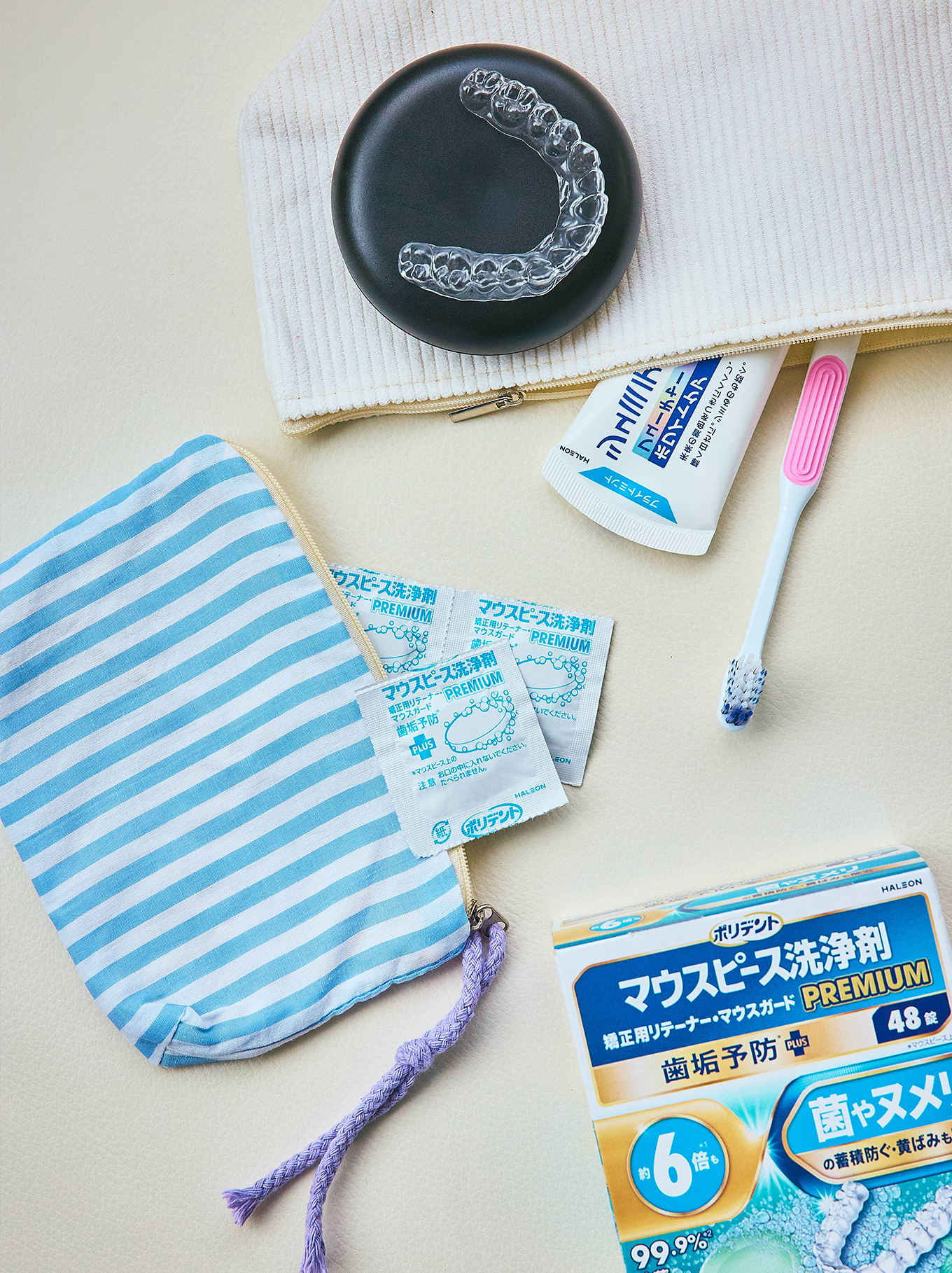 ポーチの中でも嵩張らない小さな錠剤なので旅先でのケアにも便利。復職ママなら昼食後の3分ケアでマウスピースを清潔にし、午後からの仕事&お迎えに備えるのも◎。子どものマウスピースにも使えます。 ポリデント マウスピース洗浄剤プレミアム オープン価格(Haleon)