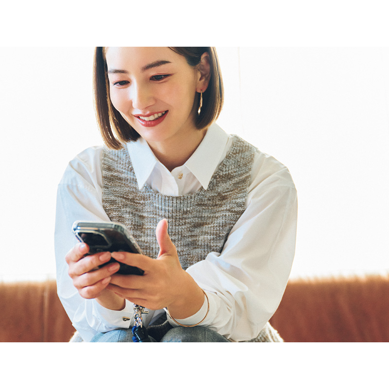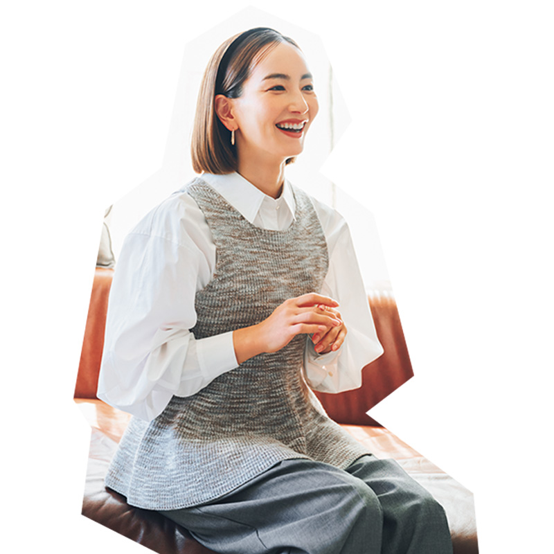 辻元さん:シャツ¥27,500(ランバン オン ブルー)ニットベスト¥17,600(マノフ╱クラネデザイン)パンツ¥22,000(エレンディーク)カチューシャ¥19,800(アレクサンドル ドゥ パリ╱アレクサンドル ドゥ パリ GINZA SIX店)ピアス¥35,200バングル¥46,200(ともにマリハ)