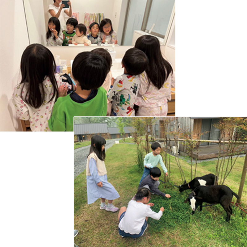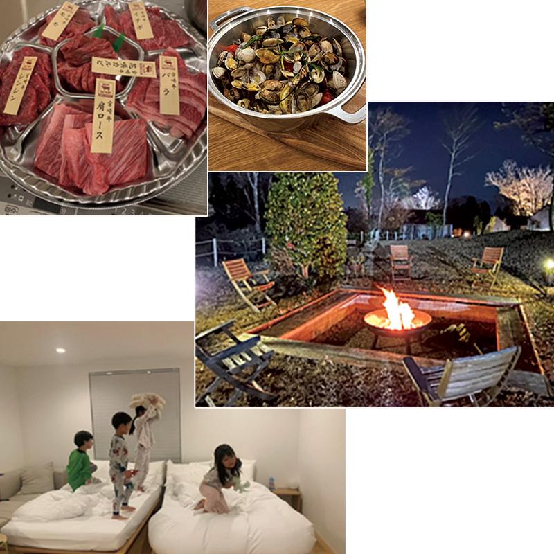 「今回は、3家族でコテージを2棟借りました。各家族ごとに車で。東名御殿場ICから車で15分と便利なのに、かなり富士山エリアの深いところまで来たような自然に囲まれた環境なのもうれしいポイント。アウトレットに寄って、それから向かっても時間に余裕がありました。チェックインしたら早速大人は乾杯。子どもたちは、ネイルを塗り合いっこしたり、広い庭を走り回り、お兄ちゃん・お姉ちゃんチームはゲームをしたりと誰もが無理せずのんびりと。夜は子どもたちみんなで先にお風呂に入り歯磨きをしてからウッドデッキから星空観察。東京ではできない体験。翌日はヤギの一家と触れ合ってチェックアウトまで過ごし、途中ランチを取ってから解散しました」