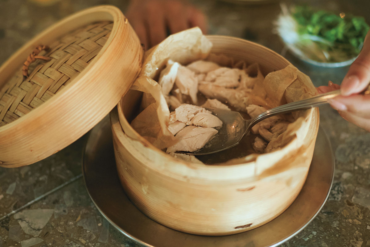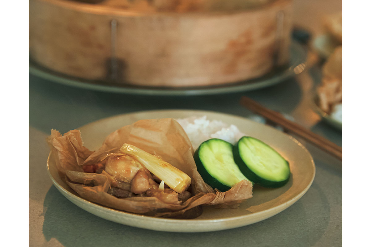 生姜と白ネギを一緒に包むことで鶏の臭みが抜けてふっくらしっとり。横で蒸したズッキーニのほくほくとした食感も蒸し鶏とベストマッチ、ご飯がすすむ!