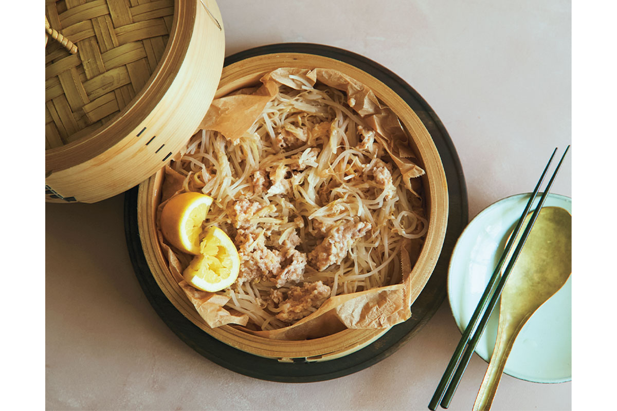 1.せいろにクッキングシートを敷き、中華麺、もやし、鶏肉ミンチ、生姜をのせて調味料をかける。