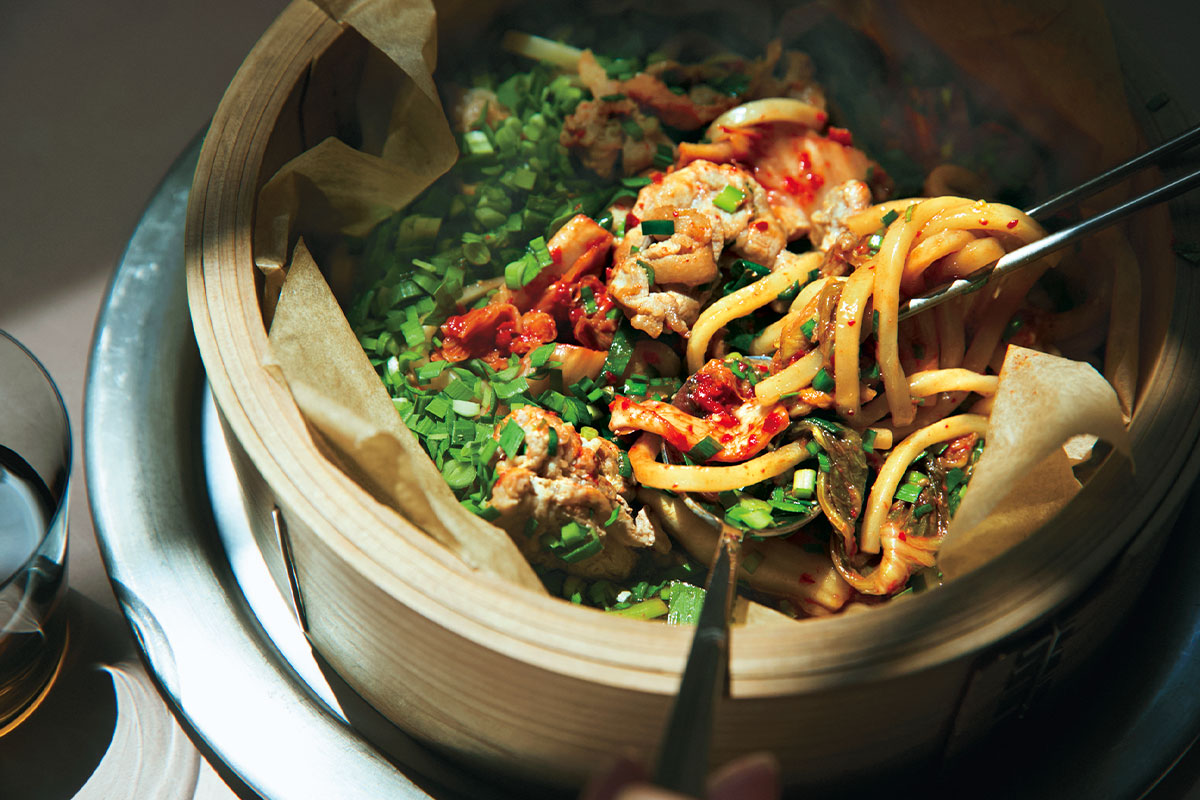 2.せいろにクッキングシートを敷いて、冷凍うどん、ざく切りにしたニラ、豚肉、キムチをのせて調味料をかける。