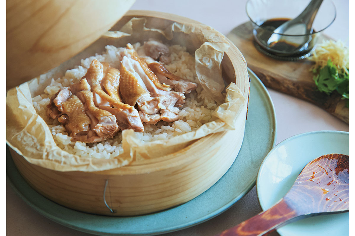 鶏モモ肉を1枚どんっと冷凍ご飯に。切らずにそのまま蒸しあげることで旨みが凝縮、本格的なカオマンガイが完成。さっぱりコクのある黒酢ダレが合う!