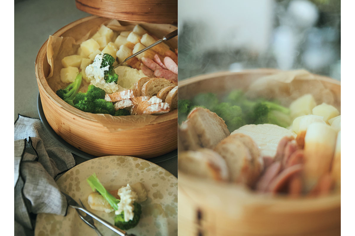 2.せいろにクッキングシートを敷いて中央にカマンベールチーズを置き、周りに1と食べやすい大きさに切ったフランスパンを置く。