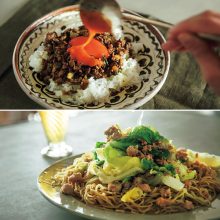 鶏モモ肉を1枚どんっと冷凍ご飯に。切らずにそのまま蒸しあげることで旨みが凝縮、本格的なカオマンガイが完成。さっぱりコクのある黒酢ダレが合う!