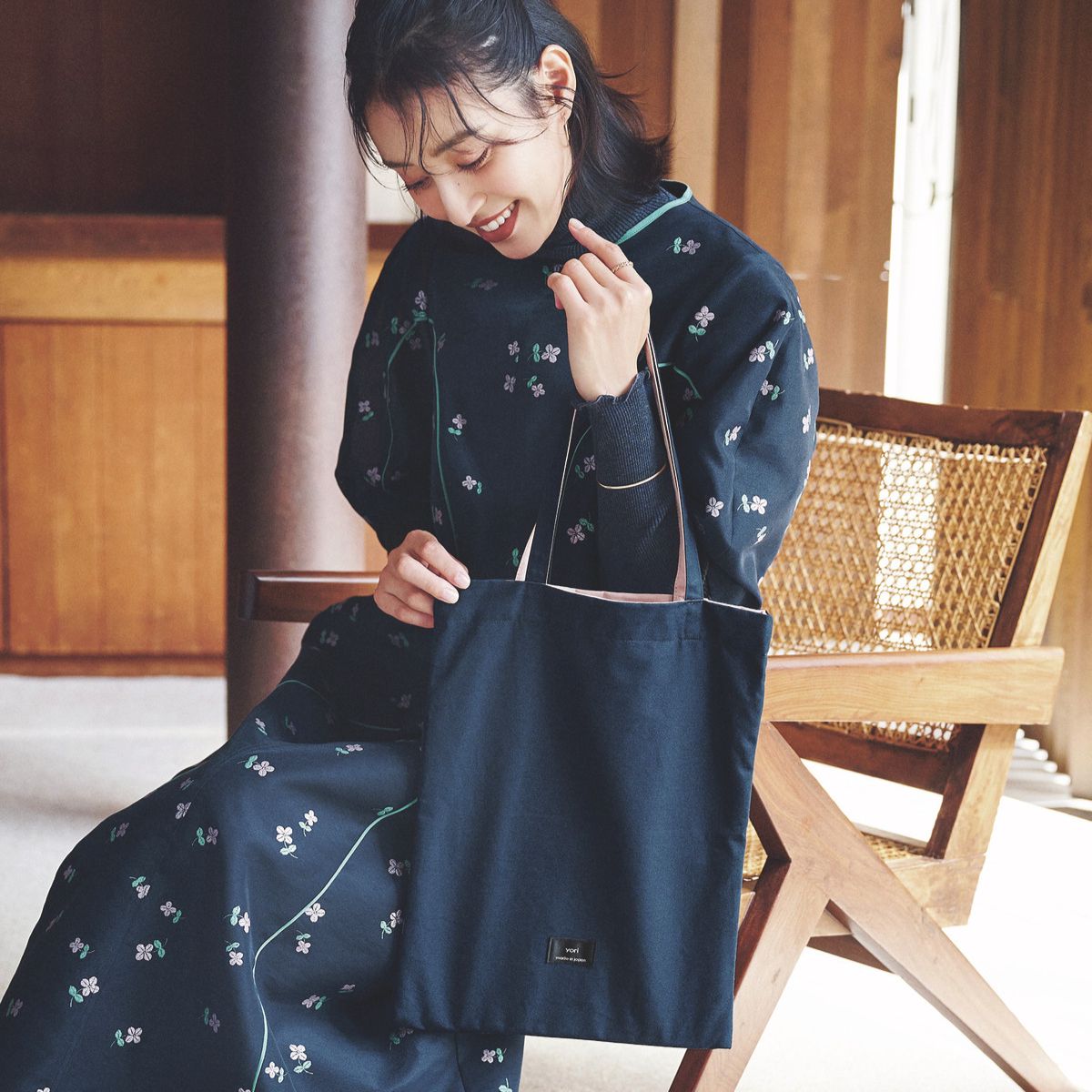 総柄プリントを裏返すと、yorタグ付きのシンプルなiキャンバス素材のネイビートートに変身! 送迎や学校説明会、仕事などのきちんとシーンに使いやすい。