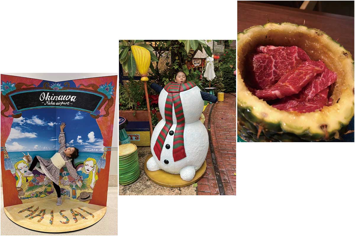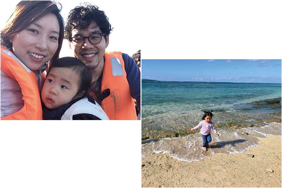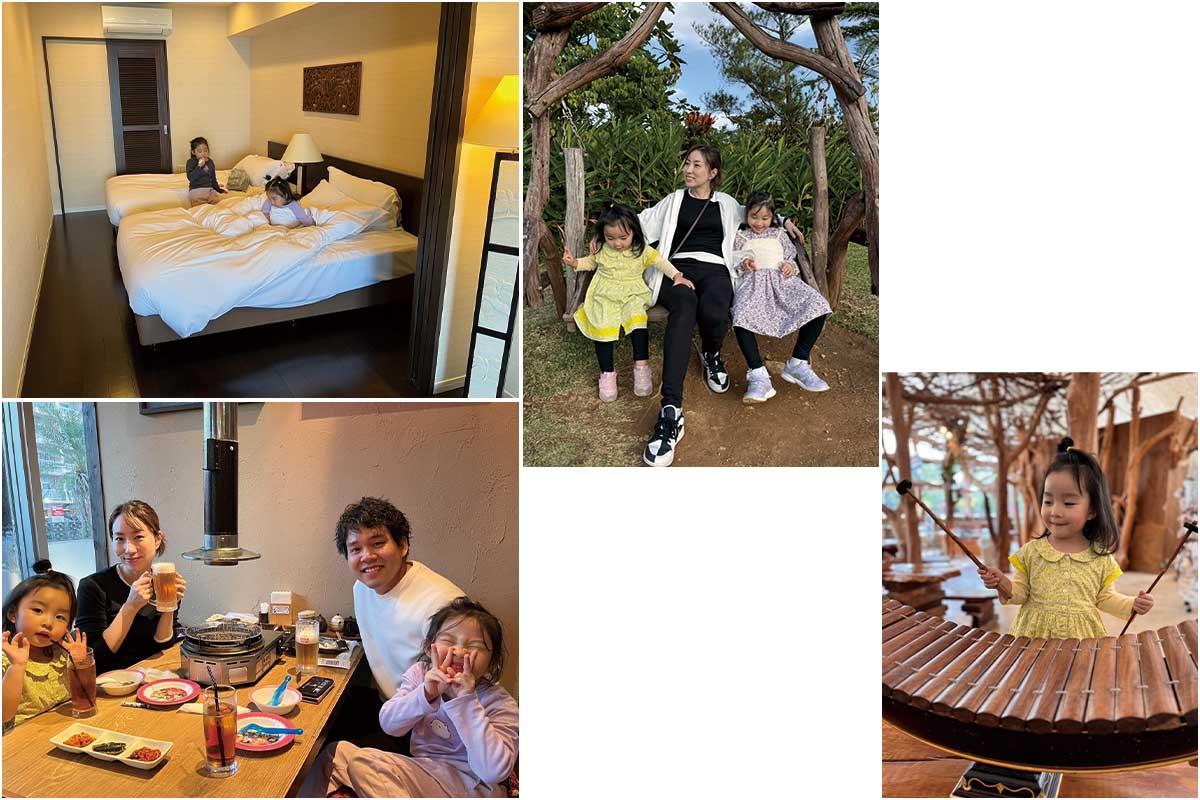 「那覇空港に到着後、早速レンタカーで恩納村へ。絶景が楽しめるカフェ「土花土花」でピザランチ。琉球焼の青風窯の器を併設のギャラリーで旅の思い出に購入。その後「ビオスの丘」へ向かい、凧揚げやハイジブランコ、巨大な木造アスレチック、湖水観賞舟など遊び尽くしました。2日目はホテルで紹介してもらったアクティビティでホエールウォッチングへ行ったり、3日目は「沖縄美ら海水族館」へ行ったりと、ホテルを基点として動きやすい立地もここが好きな理由です。食事も子どもが小さいと遠出は避けたいですが、ホテル内のレストランもクオリティが高く、歩いて行ける距離に美味しい焼肉屋や居酒屋が多く、3泊4日の滞在でも食事にバラエティがつきました」
