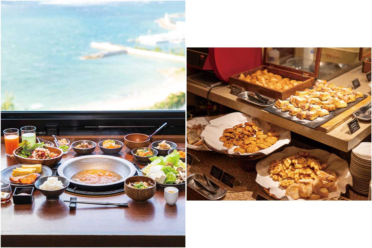 レストランは全3カ所。朝食はそれらのレストランで洋食と和食のビュッフェ、テイクアウトから選べ、和食ではあぐー豚のしゃぶしゃぶも。