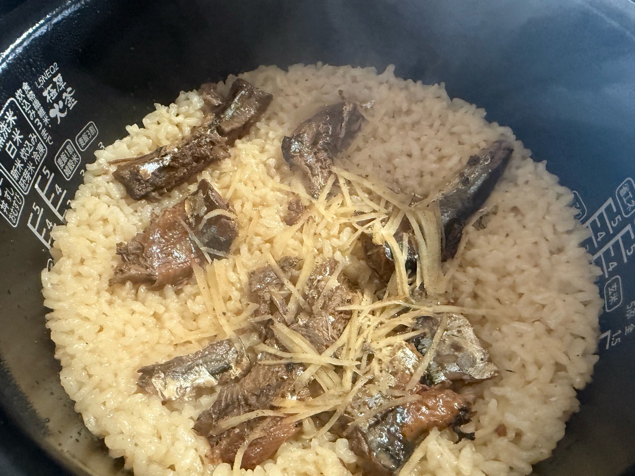 ③さんまの身をのせ、しょうがを散らして炊飯する。