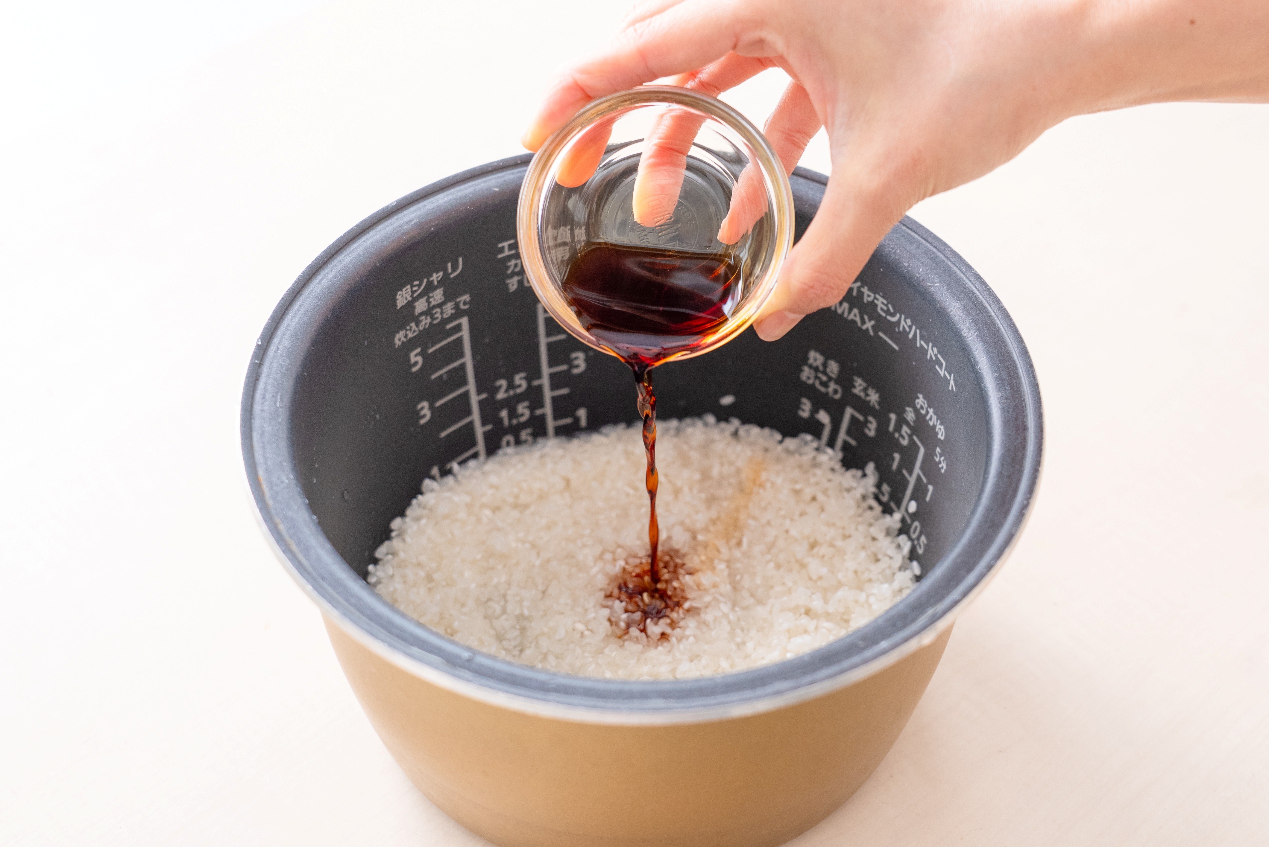②米を炊飯器に入れ、【A】を加え、さんま缶のタレもあれば入れる。2合の目盛りまで水を加え、軽く混ぜる。