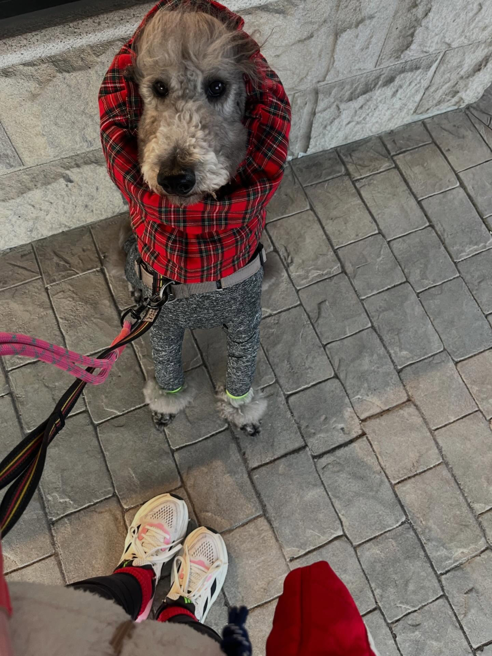 チェックのスヌードは飼い主さんの手作りだとか。愛情いっぱいであったか♡