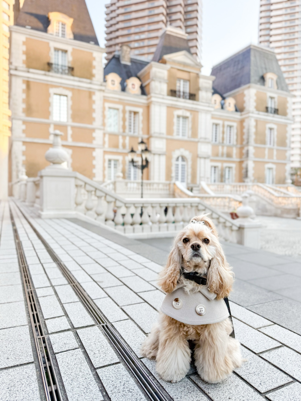 トレンチコートを着た凛々しいお座り姿は、恵比寿のオシャレな雰囲気にぴったりマッチ!