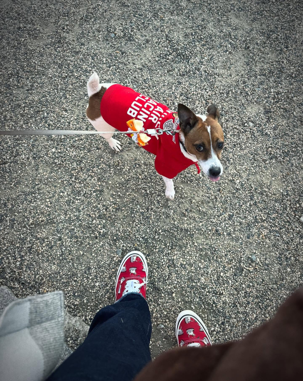 スニーカーにもたくさんのジャックラッセルが! 総勢何匹とお散歩しているのでしょうか?