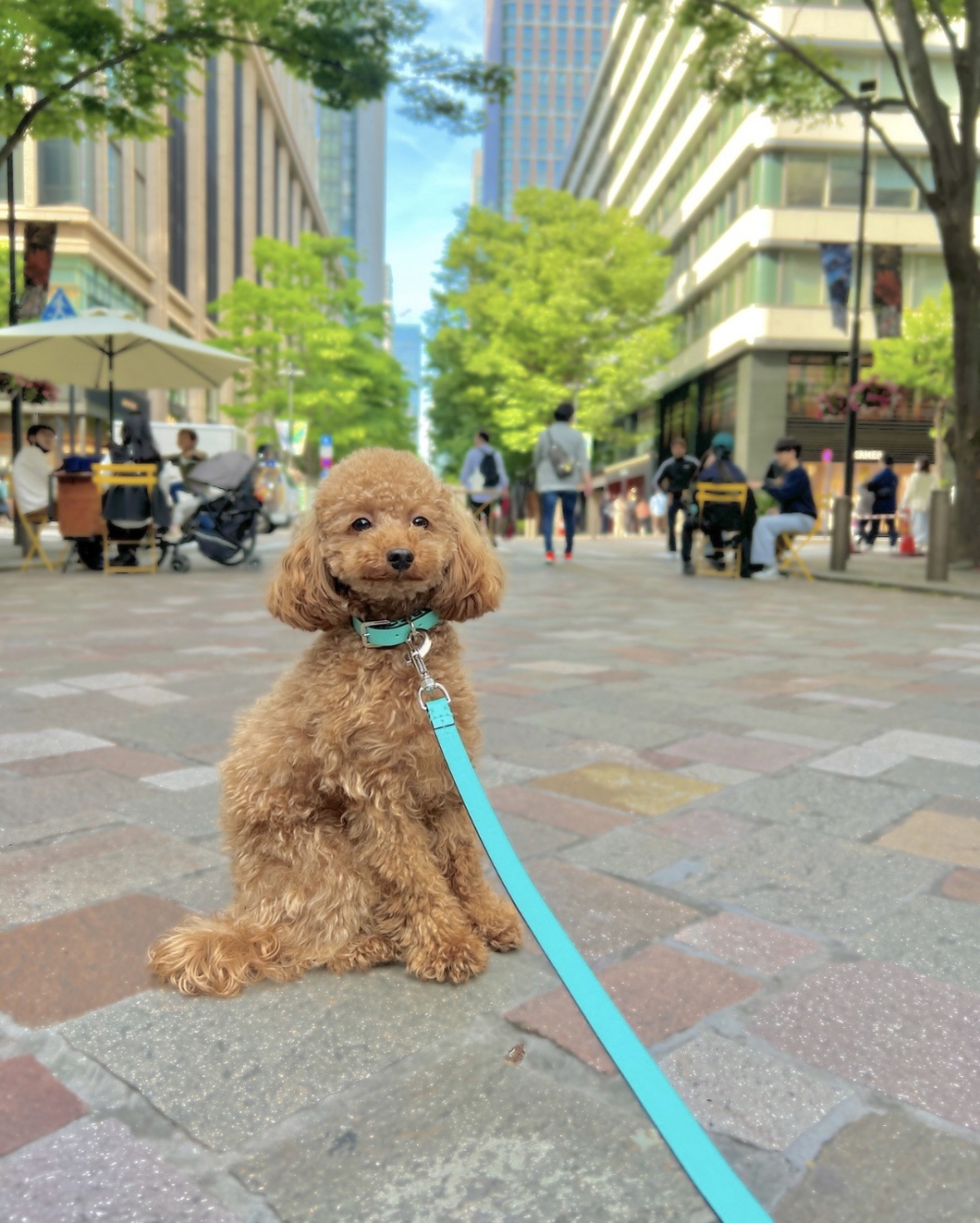 ターコイズブルーのリードが素敵! こちらのおすまし顔、実はお散歩を拒否しているそうです。