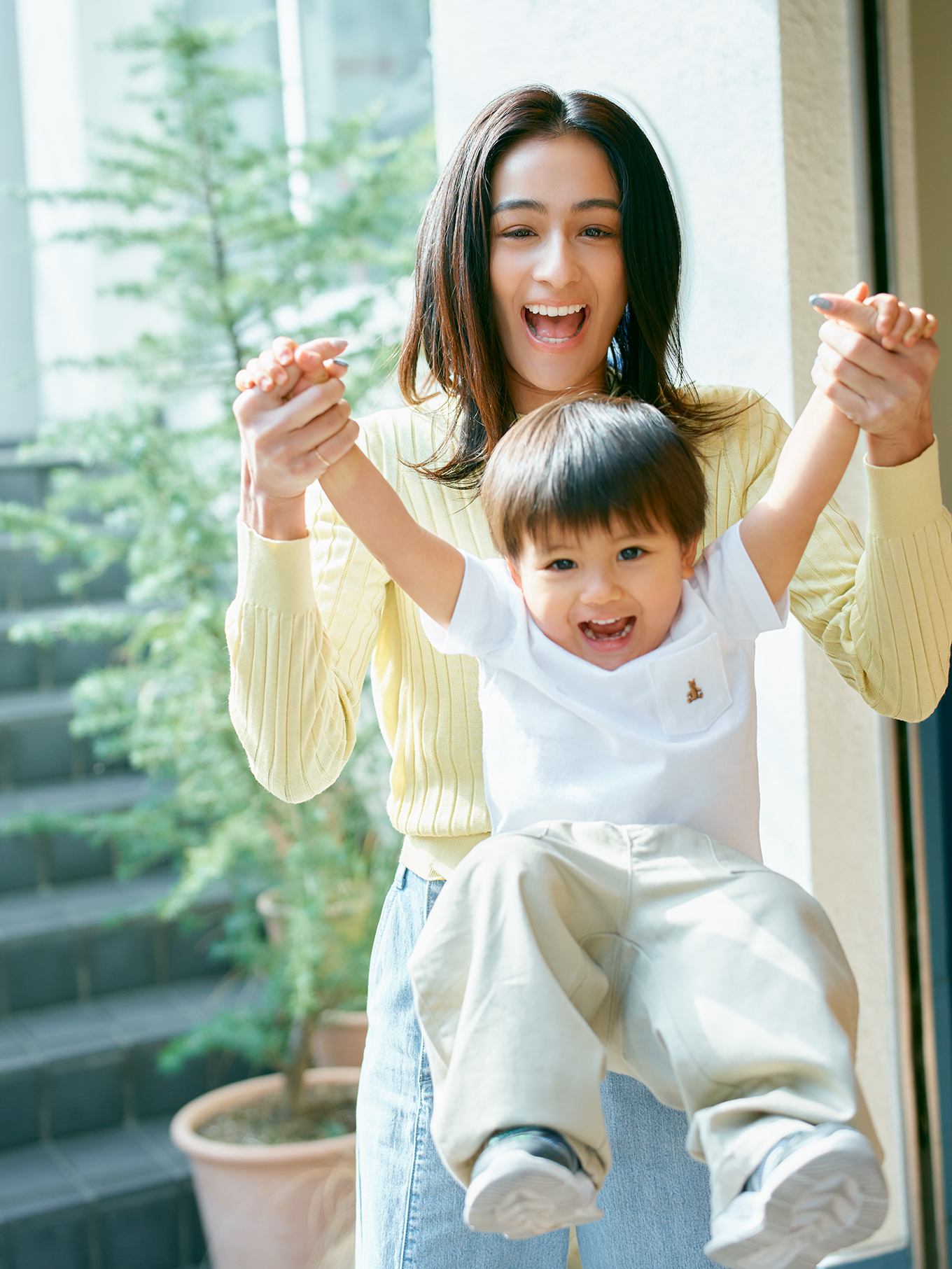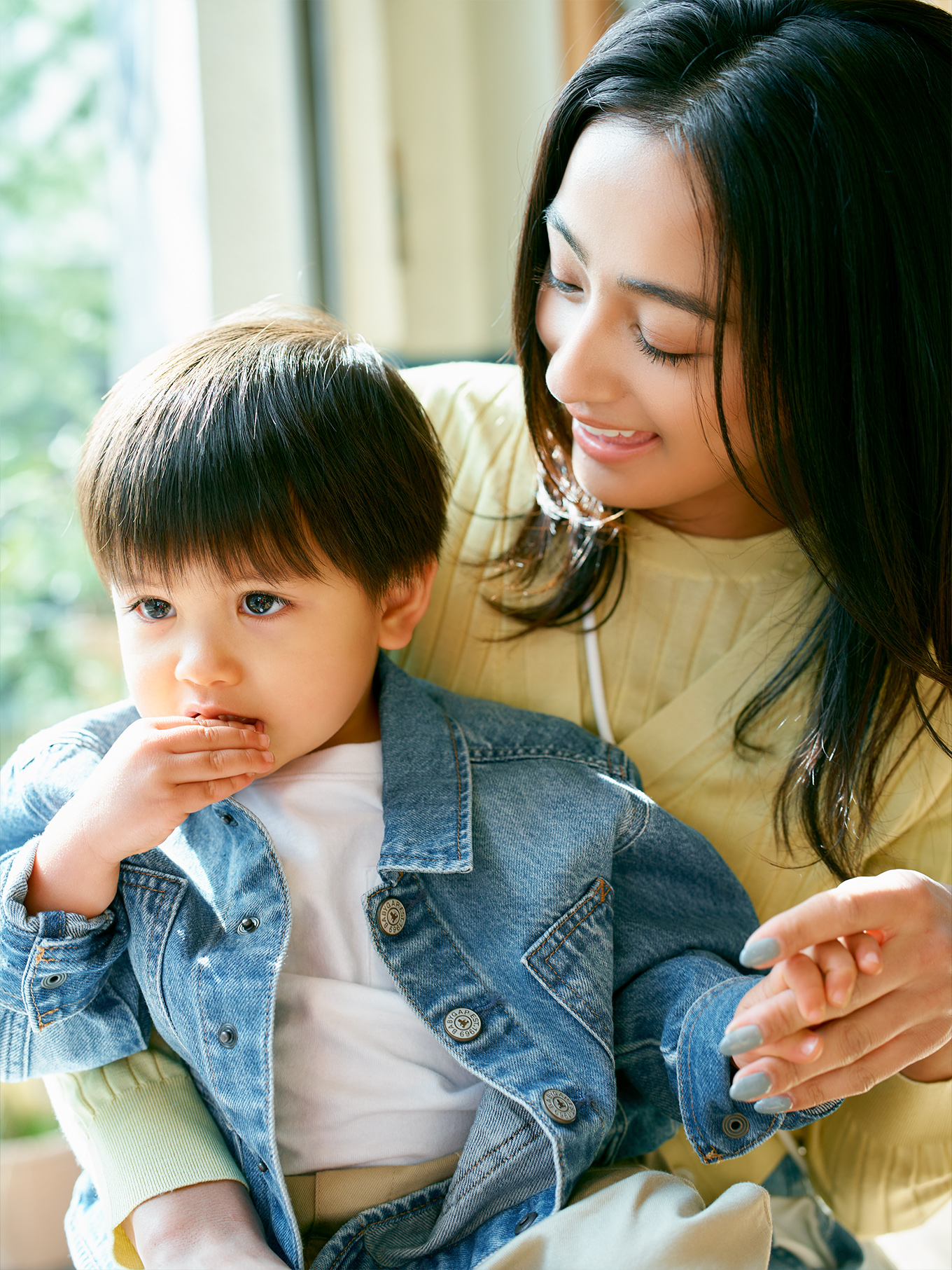 【トップ画像】<まやさん>トップス¥33,000カーディガン¥39,600(ともにスローン/ザ ショップ スローン 新静岡セノバ店)デニム¥27,500(ランバン オン ブルー)ウォレットケース¥18,150(ajew)リング¥51,700(マリハ)<キッズ>Tシャツ¥1,990デニムジャケット¥7,990パンツ¥4,990(すべてbabyGap)スニーカー本人私物