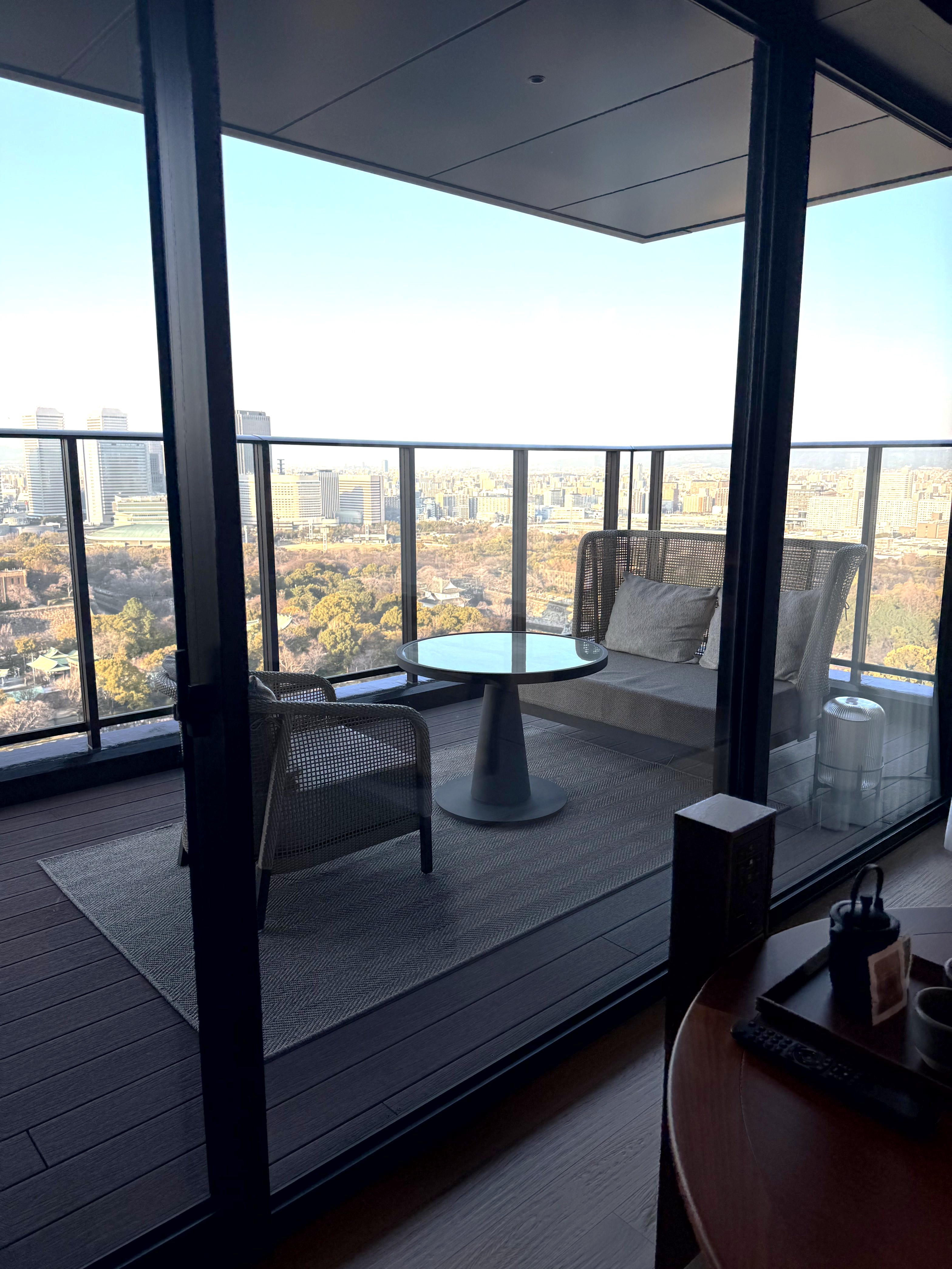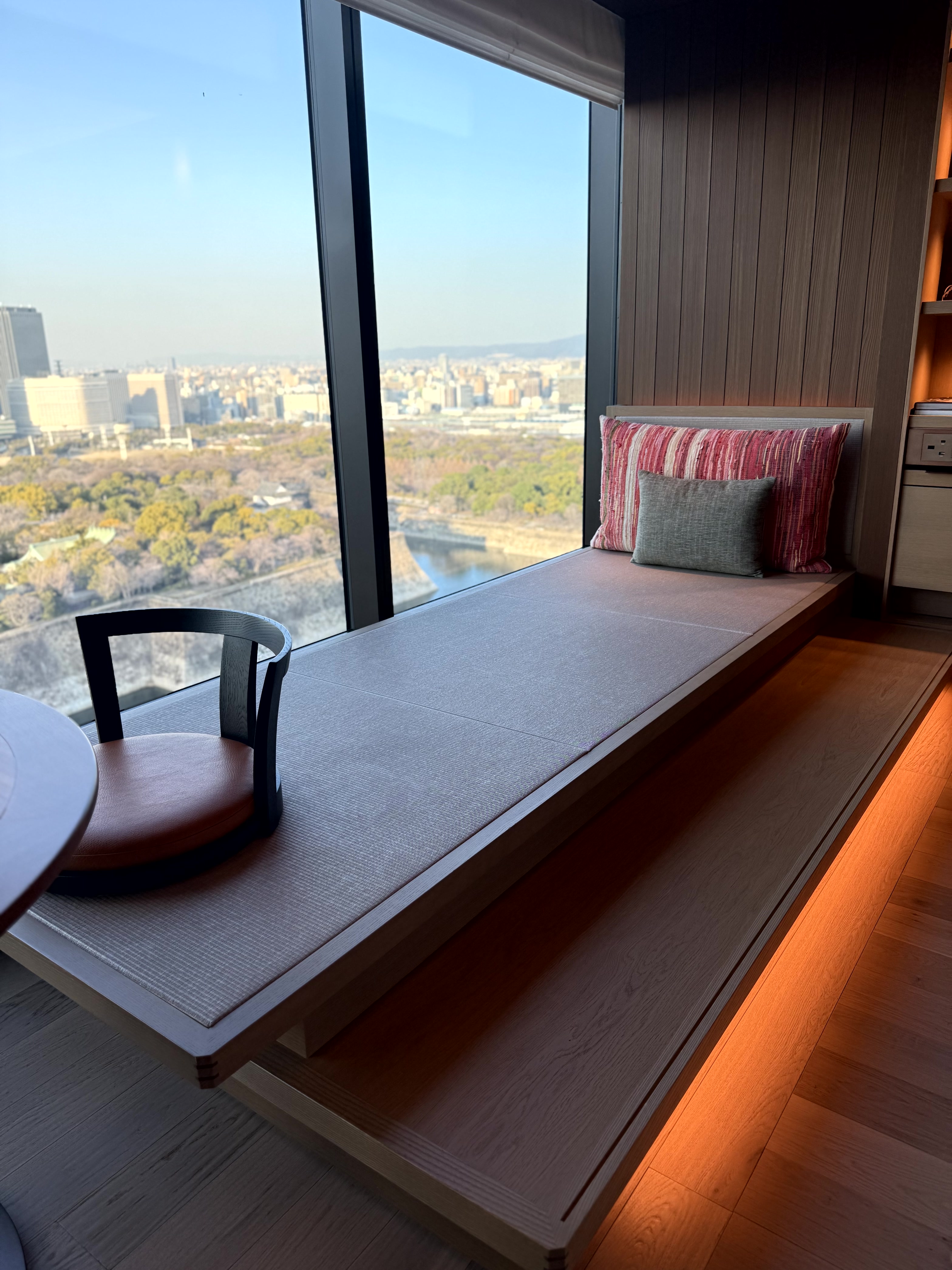 レセプションのある最上階の20階に案内されると、目の前には大阪城。オリジナルブレンドのウェルカムドリンクをいただきながら手続きを待つ間、飛行機が飛ぶ姿を何機か目にしました。聞けば、大阪城の上空が伊丹空港の飛行経路に入っているのだとか。滞在中、子どもと「何機見えるかな?」という遊びをするのも楽しそう。
