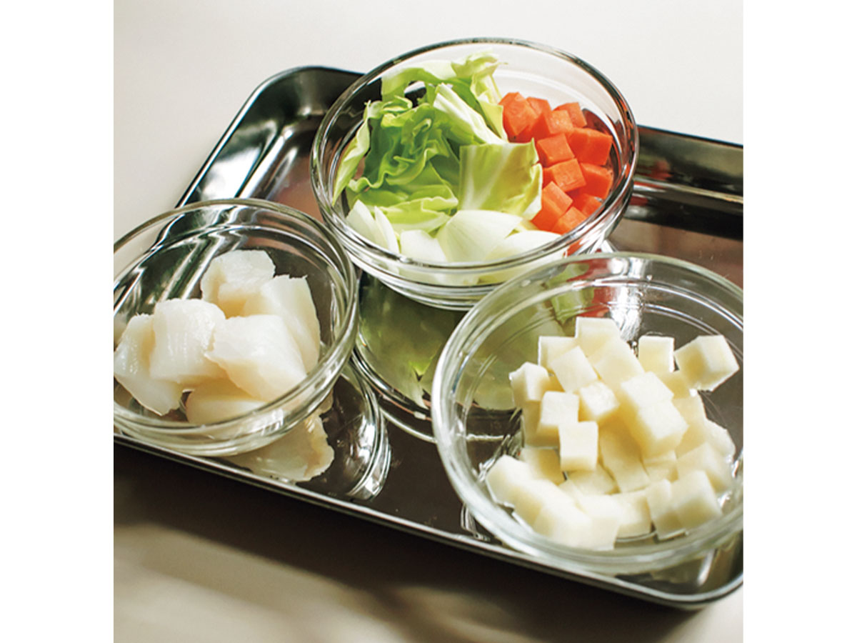 1.白身魚は皮と骨を取り除き、2〜3cm幅に切る。鯛などのお刺身だとラク。