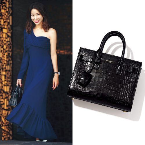 真面目顔のサンローランのクロコバッグには艶増しアイテムだけ