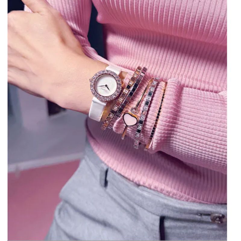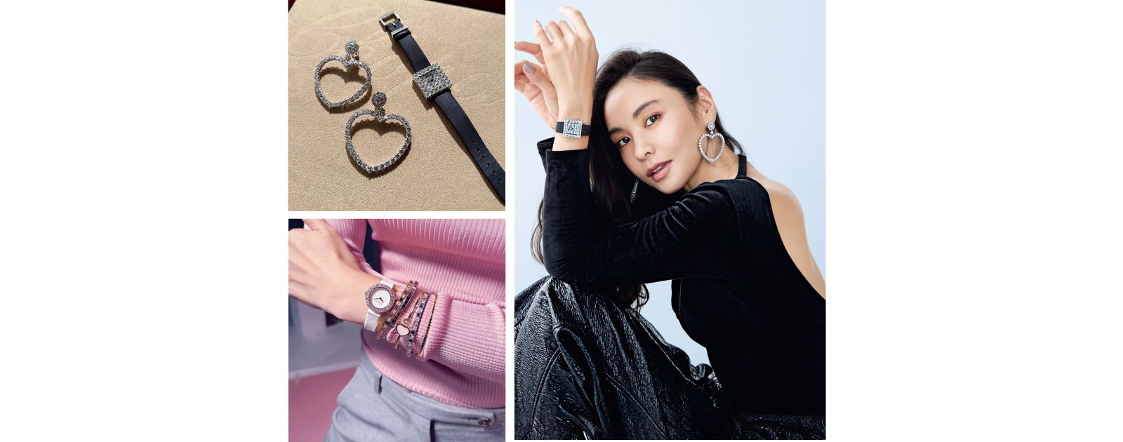まばゆいほどの輝きを放つ「アイスキューブ」のハイジュエリーウォッチはサテンストラップも相まってレディ度満点。ハートのイヤークリップを合わせて、華やかにドラマティックに。