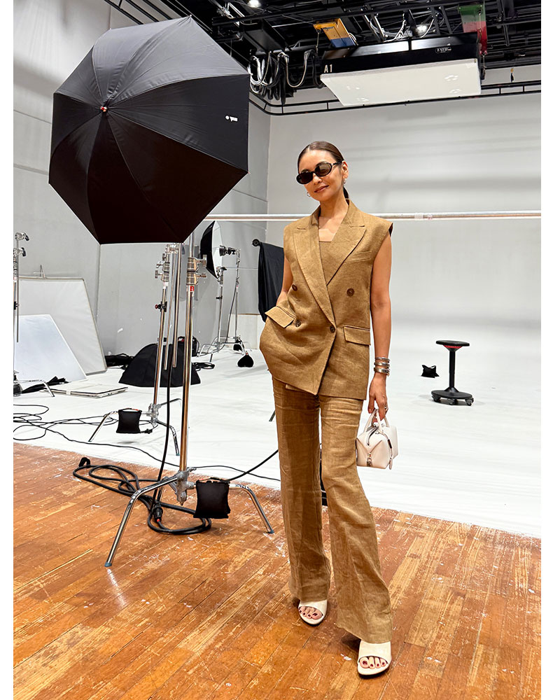 ベージュのジレセットアップと白バッグはすべてマックスマーラのもの。ティファニーのハードウエアのサングラスはかけやすくて最近お気に入りと滝沢さん。ピアスと時計はブルガリのセルペンティのもの。