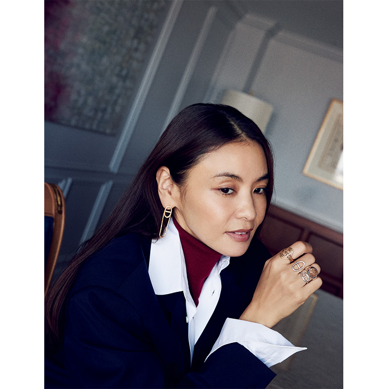 薬指上にはエルメスのエクスリブリス(蔵書印)のモチーフをコンテンポラリーに再解釈したリングを合わせて“愛着感”に奥行きを。「シェーヌ・ダンクル・ダナエ」ピアス¥1,026,300[ともにYG]リング[人差し指]¥1,006,500[薬指上]「エクスリブリス」[SV×PG]¥261,800[中指、薬指下]「シェーヌ・ダンクル・コントゥール」[WG×DIA]¥1,870,000(すべてエルメス/エルメスジャポン)ジャケット¥337,700シャツ¥96,800ニット¥78,100(すべてディースクエアード/スタッフ インターナショナル ジャパン クライアントサービス)