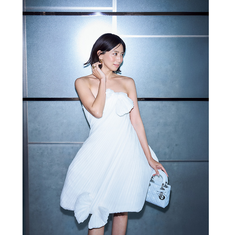 パーティにお呼ばれしたら?まずは招待状からイベント趣旨を解読し、場を最大限に盛り立てるドレスアップにトライ!まるでミルフィーユのようなバイアスドレープとリボンがあしらわれたミニドレスは、初対面の人とも自然と会話が弾むアイキャッチィなデザイン。新生ディオールのファーストルックとして話題をさらったピースをいち早く自分のスタイルに取り入れて。そんな、オシャレに対するあくなき冒険心が周囲をもハッピームードに。ドレス¥3,400,000[参考価格]バッグ¥860,000 ピアス¥105,000 リング¥62,000(すべてディオール/クリスチャン ディオール)