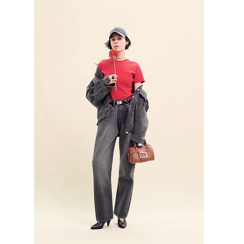 デニムパンツはメンズの32を着用。ジャケット¥15,400パンツ¥16,500(ともにリーバイス®/リーバイ・ストラウス ジャパン)Tシャツ¥19,800(ユナス/エストネーション)バッグ¥424,600(ロジェ ヴィヴィエ/ロジェ・ヴィヴィエ・ジャパン)シューズ¥135,300(セルジオ ロッシ/セルジオ ロッシ ジャパン カスタマーサービス)キャップ¥8,800(ブラミンク/ブラミンク トーキョー)ベルト¥39,600(RH ヴィンテージ/ロンハーマン)イヤリング¥2,728,000リング¥1,328,800(ともにヴェルニエ/リシュモン ジャパン ヴェルニエ)