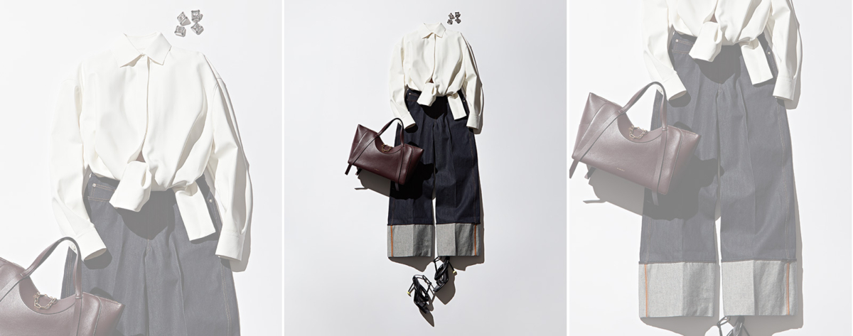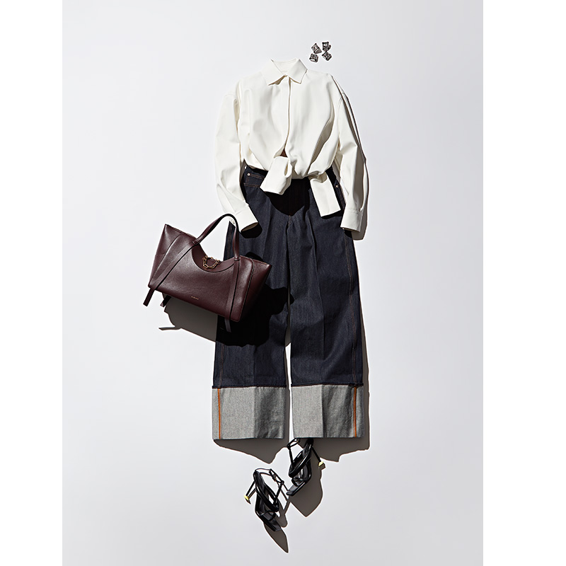 ソフトレザーのシャツ&大胆なロールアップのデニム、ランウェイでも視線を集めたLOOKとともに。バッグはスモール~ラージの3サイズ展開。全8色の豊かなカラーバリエーションも魅力。シャツ¥1,034,000*参考価格パンツ¥235,400バッグ「ザ・スナッチ〈ラージ〉」[H24×W41×D17cm]¥539,000シューズ[H9.4cm]¥198,000イヤリング¥167,200(すべてジバンシィ by サラ・バートン/ジバンシィ ジャパン)