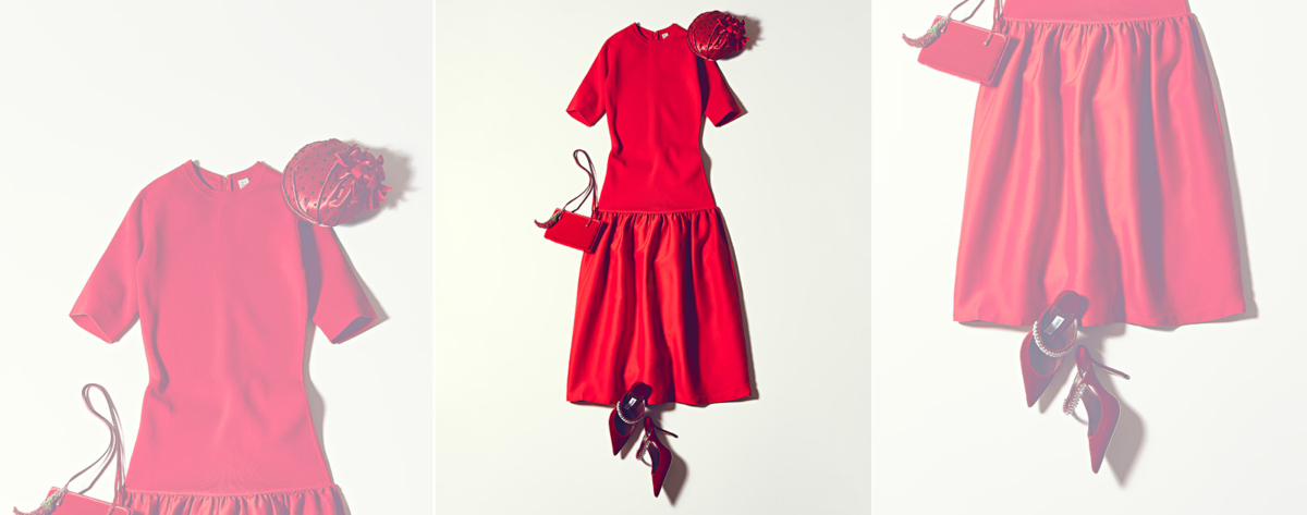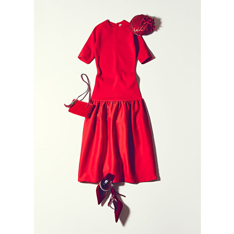 ワントーンにドラマを生む質感異なる赤のレイヤード