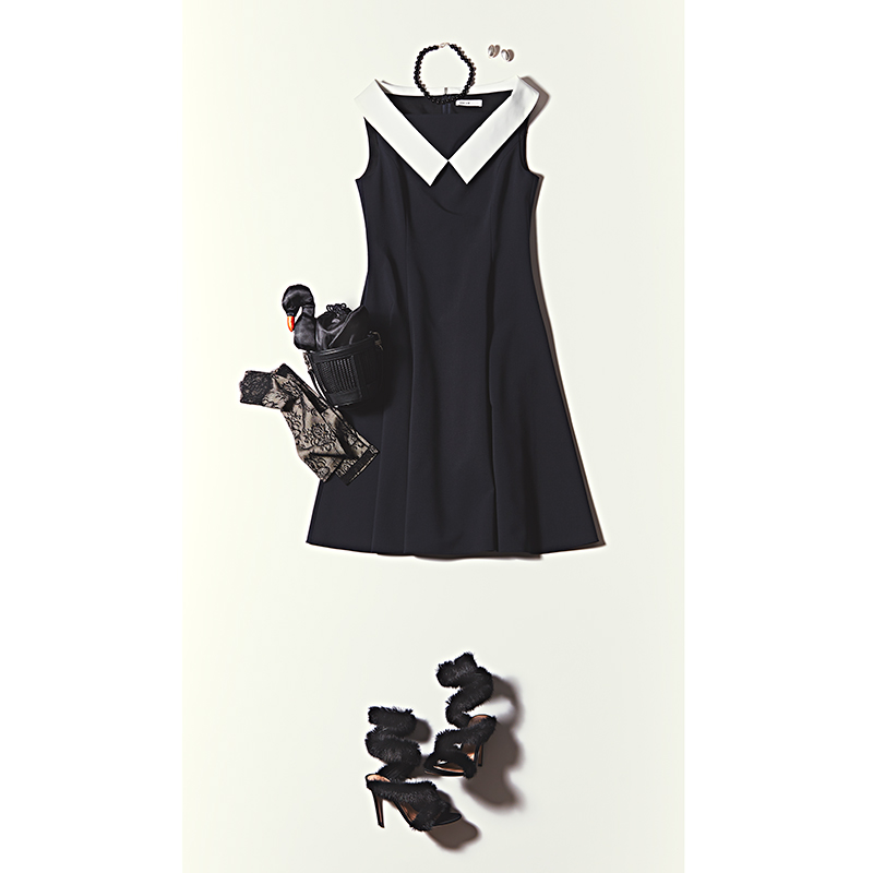 きちんと感のあるストレッチスーチング生地を採用。ドレス¥121,000(ADEAM/ADEAM 東京ミッドタウン店)グローブ¥7,150(アルタクラッセカプリガンティ/アルタクラッセカプリガンティ 広尾店)バッグ¥253,000(NAOKO TAKAI/NT.Inc)シューズ¥291,500(ジャンヴィト ロッシ/ジャンヴィト ロッシ ジャパン カスタマーサービス)イヤリング¥35,200(ニナ・エ・ジュール/ショールーム ロイト)ネックレス¥24,200(オクチジュエリー/フラッパーズ)