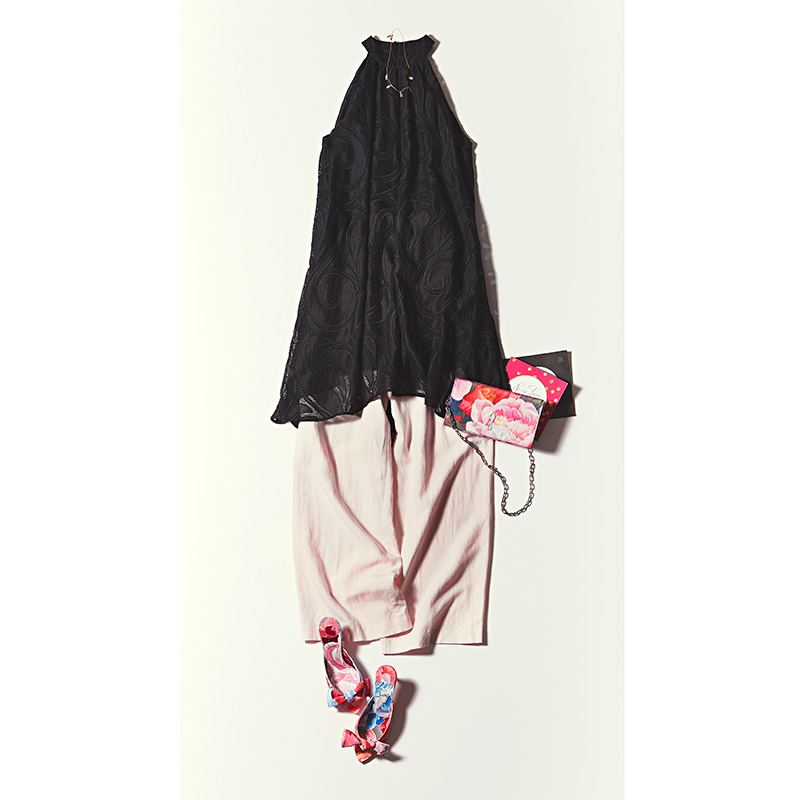 エレガントなラミー刺繍のドレスに、リネン混素材のワイドレッグパンツをセット。ドレスアップ経験値とコーデ力を備えた大人ならではの余裕感漂う装いに。ドレス¥123,200パンツ¥58,300(ともにボス/ヒューゴ ボス ジャパン)バッグ¥254,100シューズ¥172,700(ともにクリスチャン ルブタン/クリスチャン ルブタン ジャパン)ネックレス¥946,000(メシカ/メシカ ジャパン)