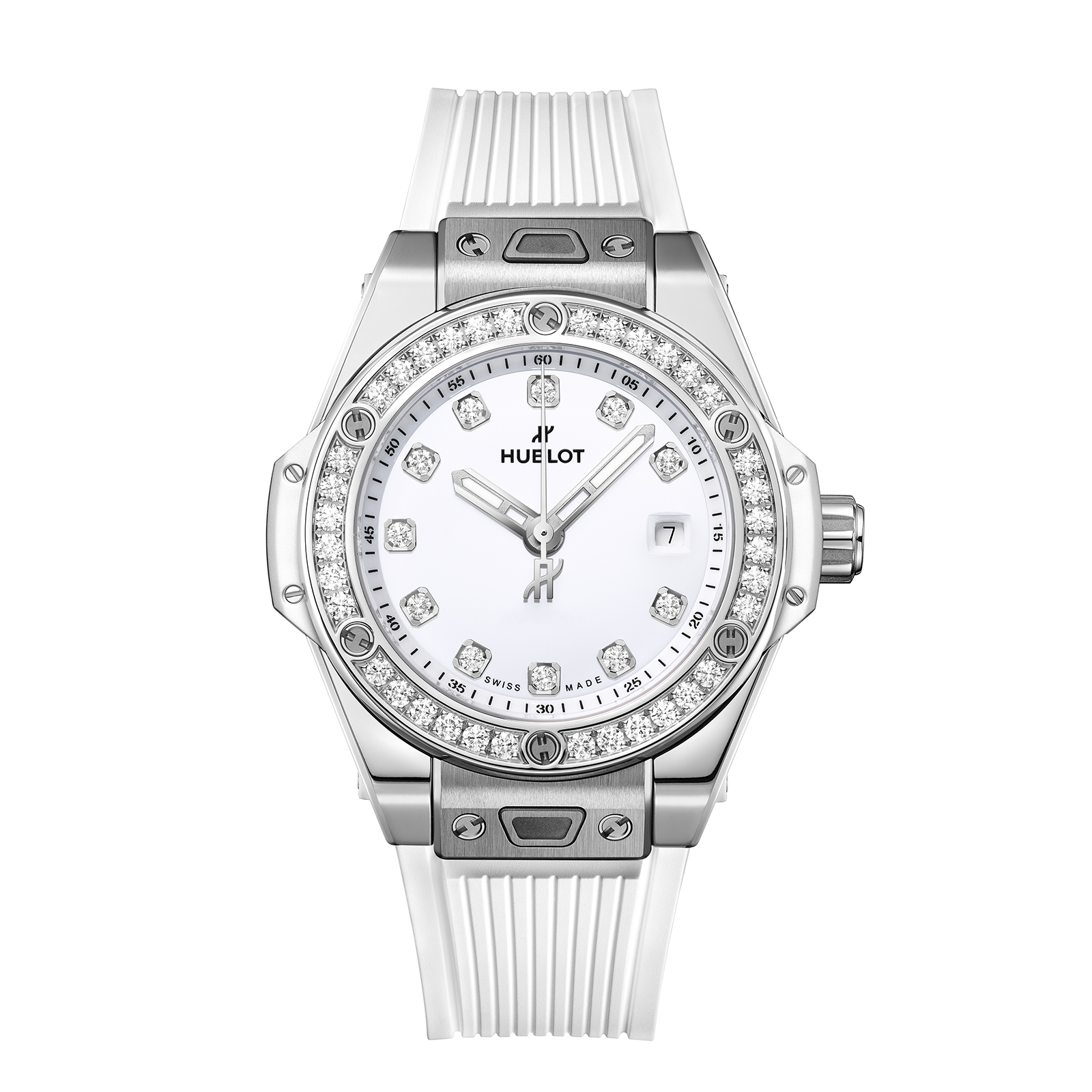 ウブロの中でも注目度が上がっているアルミ素材。素材の特性を生かしつつ、発色にこだわったピンクは、ベゼルやラバーストラップまで色のトーンを揃えることで上品な印象に。簡単にストラップチェンジが叶うのも、このモデルのいいところ。仕上げにアルマイト加工を施しているため傷がつきにくく、キレイがずっと続く。