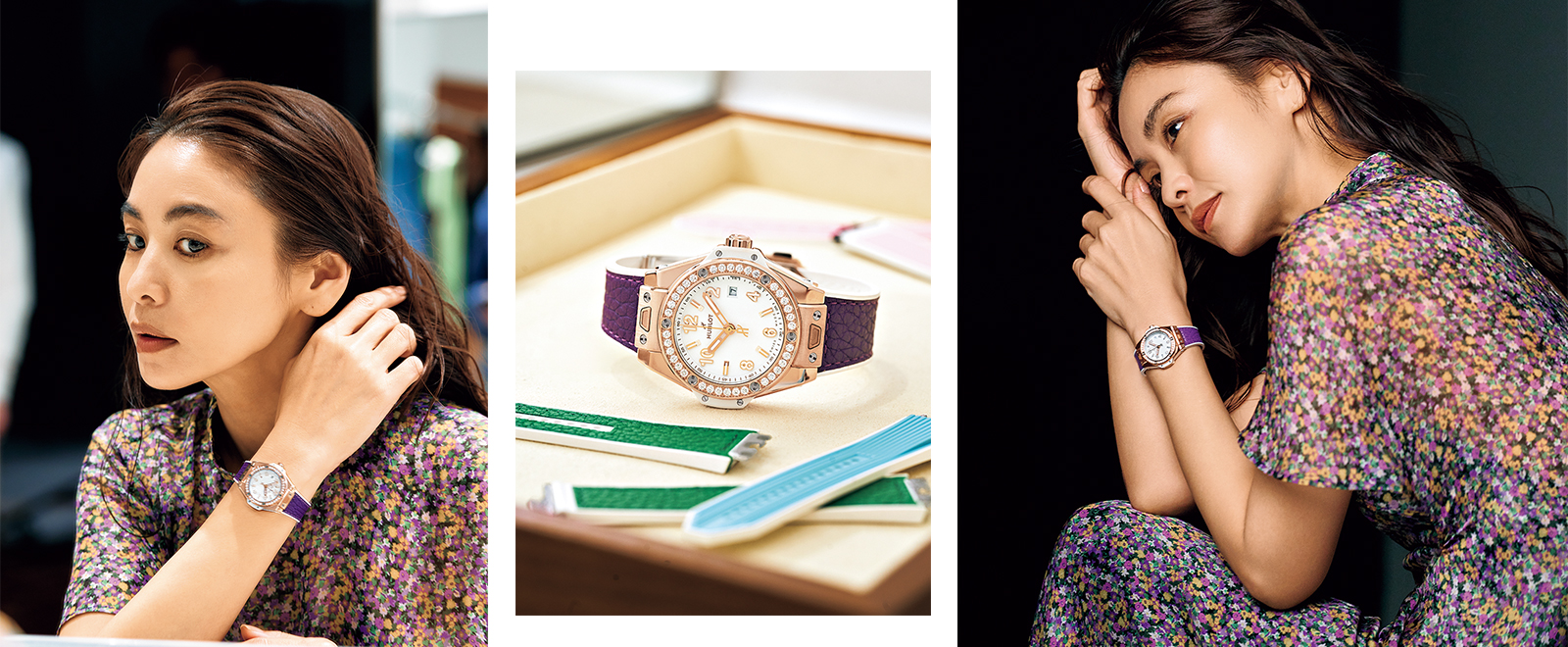 滝沢さんと冒険FASHIONを楽しむ連載、今号テーマは〝サマーレディ〟。この春夏はちょっぴりキレイめ気分。夏の奔放な気分はそのまま、シックなオシャレを目指すなら、自ら簡単にストラップチェンジが叶う「ビッグ・バン ワンクリック」がおすすめ。標準の白ラバーストラップ→パープル、印象チェンジが自在です♡