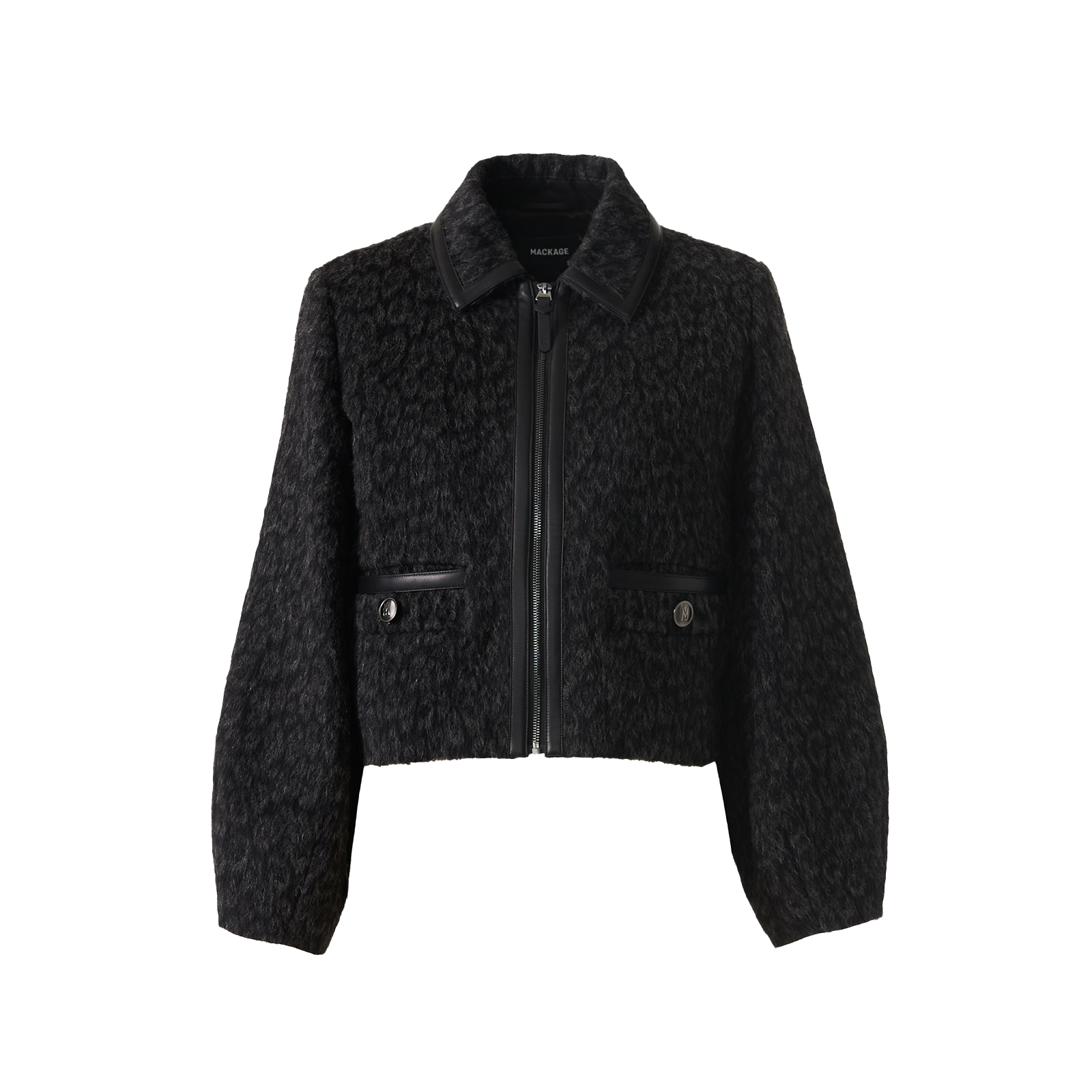 華やかさと地に足の着いた大人の雰囲気を両立する、チーター柄ジャケット。ウール&アルパカの毛足が長く暖かな素材に、シープレザーのパイピングがクールなアクセント。ポケットの、ブランドロゴの〝M〟入りボタンもクワイエットなワンポイント。